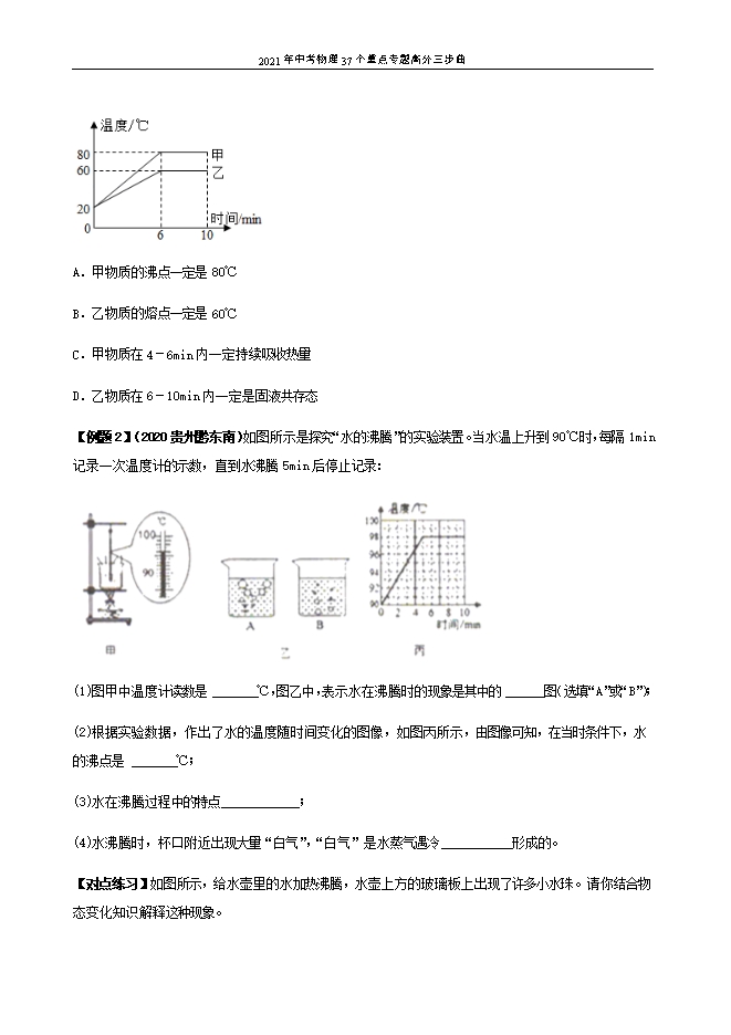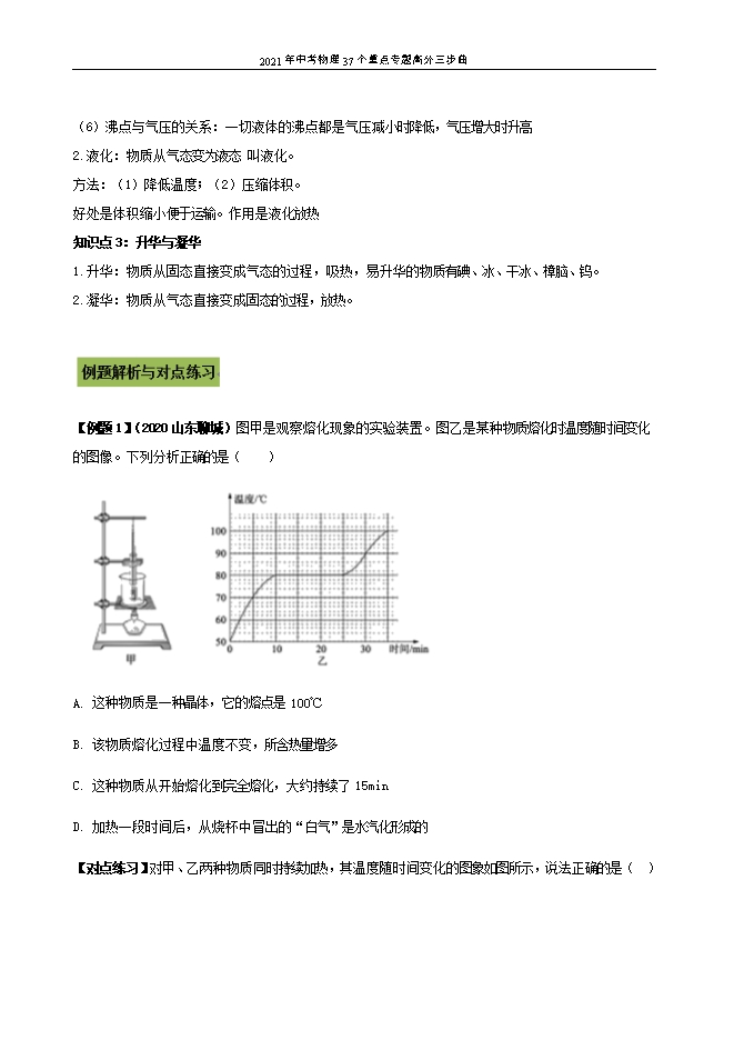 【内容简介】知识点1:熔化与凝固1.熔化:物体从固态变成液态叫熔化。(1)熔化特点:固液共存,吸热,温度不变;吸热,先变软变稀,最后变为液态温度不断上升。(2)熔点:晶体熔化时的温度。 (3)熔化的条件:(1)达到熔点。(2)继续吸热。2.凝固:物质从液态变成固态叫凝固。(1)凝固特点:固液共存,放热,温度不变;放热,逐渐变稠、变黏、变硬、最后成固体,温度不断降低。(2)凝固点:晶体熔化时的温度 (3)凝固的条件: 达到凝固点。继续放热。同种物质的熔点凝固点相同。知识点2:汽化与液化1.汽化:物质从液态变为气态叫汽化。(1)液体在任何温度下都能发生的,并且只在液体表面发生的汽化现象 叫蒸发。 (2)影响因素:液体的温度;液体的表面积;液体表面空气的流动。(3)作用是蒸发吸热(吸外界或自身的热量),具有制冷作用。在一定温度下,在液体内部和表面同时发生的剧烈的汽化现象。(4)沸点:液体沸腾时的温度。(5)沸腾条件:达到沸点。继续吸热 (6)沸点与气压的关系:一切液体的沸点都是气压减小时降低,气压增大时升高2.液化:物质从气态变为液态 叫液化。方法:(1)降低温度;(2)压缩体积。好处是体积缩小便于运输。作用是液化放热知识点3:升华与凝华1.升华:物质从固态直接变成气态的过程,吸热,易升华的物质有碘、冰、干冰、樟脑、钨。2.凝华:物质从气态直接变成固态的过程,放热。 【例题1】(2020山东聊城)图甲是观察熔化现象的实验装置。图乙是某种物质熔化时温度随时间变化的图像。下列分析正确的是( ) A. 这种物质是一种晶体,它的熔点是100℃B. 该物质熔化过程中温度不变,所含热量增多C. 这种物质从开始熔化到完全熔化,大约持续了15minD. 加热一段时间后,从烧杯中冒出的“白气”是水汽化形成的【答案】C【解析】A.由图可知,该物质熔化时,不断吸收热量,温度保持不变,所以该物质是晶体,它的熔点是80℃,故A错误;B.该物质熔化过程中温度不变,吸收的热量增多,热量是过程量,不能说“含有”,故B错误;C.这种物质从开始熔化到完全熔化,大约持续的时间t=25min-10min=15min故C正确;D.加热一段时间后,从烧杯中冒出的“白气”是水蒸气遇冷液化形成的小水珠,故D错误。【对点练习】对甲、乙两种物质同时持续加热,其温度随时间变化的图象如图所示,说法正确的是( ) A.甲物质的沸点一定是80℃B.乙物质的熔点一定是60℃C.甲物质在4﹣6min内一定持续吸收热量D.乙物质在6﹣10min内一定是固液共存态【答案】C.【解析】晶体的熔化和液体的沸腾过程中吸热温度不变.晶体在熔化过程中处于固液共存状态.AB.甲乙两种物质不能确定其本身的状态,不知道是晶体的熔化还是液体的沸腾,故不能确定是熔点还是沸点,故AB错误;C.甲物质在4﹣6min内,温度升高,一定持续吸收热量,故C正确;D.由于不能确定图象是晶体的熔化还是液体的沸腾,故不能确定乙物质在6﹣10min内的状态,故D错误.