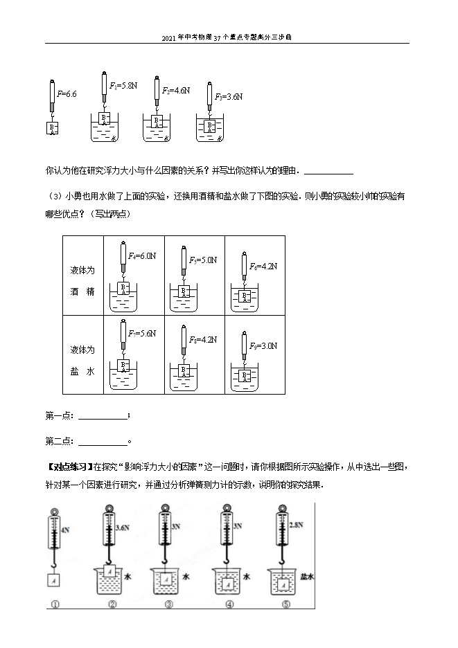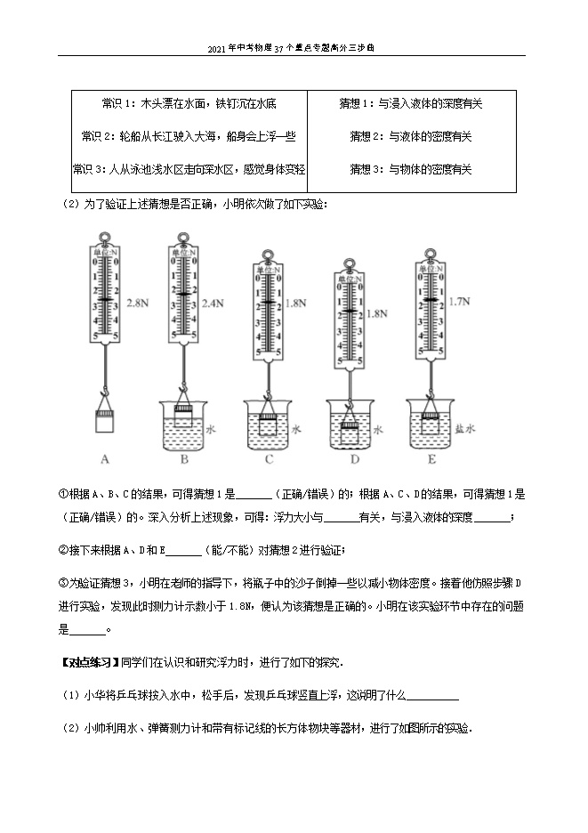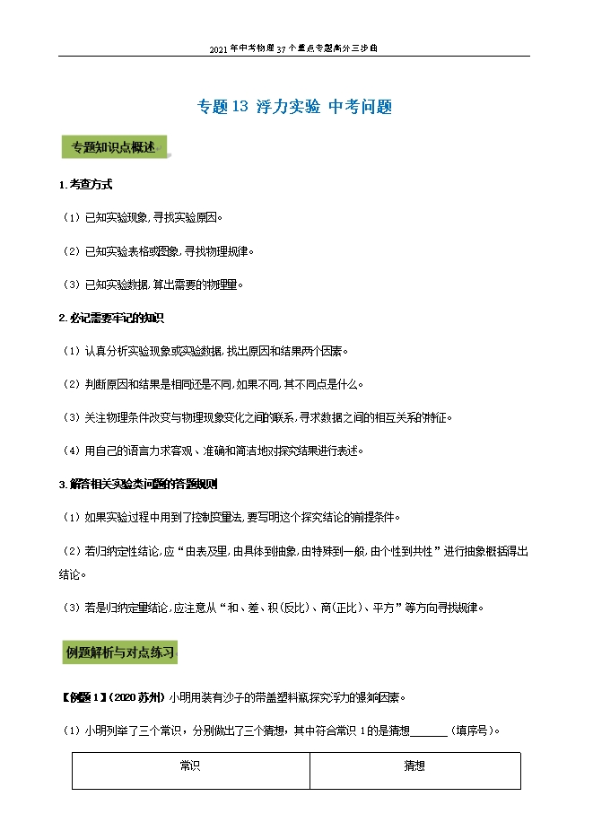 专题13 中考浮力实验--2021年中考物理37个重点专题高分三步曲(原卷版和解析版)