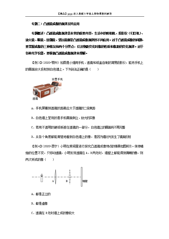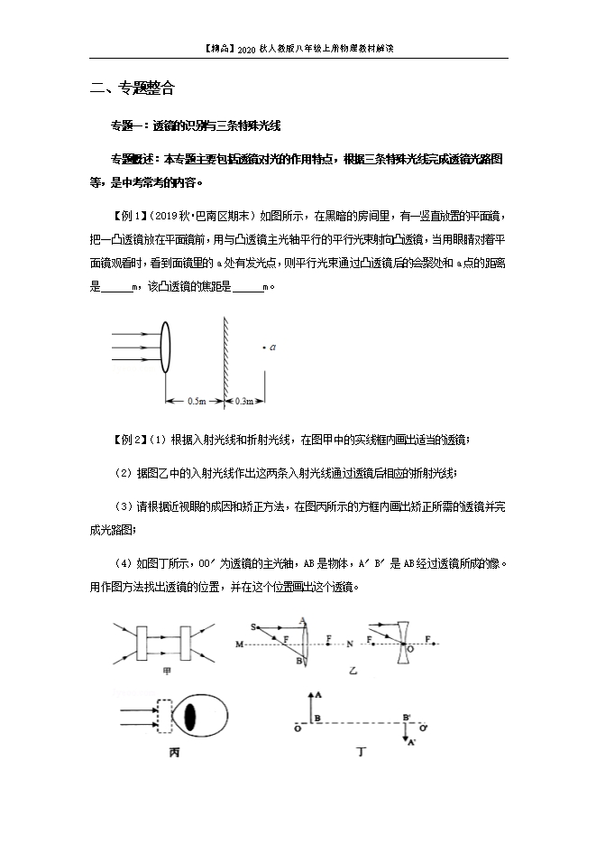 【内容简介】专题一∶透镜的识别与三条特殊光线专题概述∶本专题主要包括透镜对光的作用特点,根据三条特殊光线完成透镜光路图等,是中考常考的内容。【例1】(2019秋•巴南区期末)如图所示,在黑暗的房间里,有一竖直放置的平面镜,把一凸透镜放在平面镜前,用与凸透镜主光轴平行的平行光束射向凸透镜,当用眼睛对着平面镜观看时,看到面镜里的a处有发光点,则平行光束通过凸透镜后的会聚处和a点的距离是 m,该凸透镜的焦距是 m。 【答案】0.6;0.2【解答】解:由题知,当用眼睛观察镜子时,光束似乎是从a处发散开来的,则凸透镜的焦点在平面镜前面,而物体在平面镜中成像时,物像关于平面镜对称,根据平面镜成像特点作出凸透镜的焦点F,如图所示: 光束会聚处F和a点的距离s=2×0.3m=0.6m;焦距是焦点到光心的距离,则凸透镜的焦距:f=0.5m﹣0.3m=0.2m。【例2】(1)根据入射光线和折射光线,在图甲中的实线框内画出适当的透镜;(2)据图乙中的入射光线作出这两条入射光线通过透镜后相应的折射光线;(3)请根据近视眼的成因和矫正方法,在图丙所示的方框内画出矫正所需的透镜并完成光路图;(4)如图丁所示,OO′为透镜的主光轴,AB是物体,A′B′是AB经过透镜所成的像。用作图方法找出透镜的位置,并在这个位置画出这个透镜。 【答案】见试题解答内容【解答】解:(1)前面入射光线是会聚的,经过透镜折射后,变为了平行光,由此可知该透镜对光线有发散作用,应该是凹透镜;后面平行光经过透镜折射后变得发散,由此可知该透镜对光线有发散作用,因此是凹透镜。如图所示: (2)平行于主光轴的光线经凸透镜折射后将过焦点,过焦点的光线经凸透镜折射后折射光线平行于主光轴;平行于主光轴的光线经凹透镜折射后折射光线反向延长通过焦点,过光心的光线其传播方向不变,如图所示: (3)近视眼是晶状体曲度变大,会聚能力增强,即折光能力增强,像呈在视网膜的前方,应佩戴发散透镜,使光线推迟会聚。如图所示: (4)连接A、A′,与主光轴相交于一点,即为凸透镜的光心。然后即可做出凸透镜,如下图所示: 专题二∶凸透镜成像的规律及其应用专题概述∶凸透镜成像规律是本章的重要内容,生活中的照相机、投影仪(幻灯机)、放大镜、眼镜、显微镜、望远镜都是凸透镜成像规律的不同应用。对于凸透镜成像的间题,要掌握成像的三种情况和两个分界点,以及物距变化时像的性质和像距的变化规律。对于各种光学仪器,要根据凸透镜成像规律来理解。【例3】(2020•鄂州)如图是小强用手机、透镜和纸盒自制的简易投影仪,能将手机上的画面放大投射到白色墙上。下列说法正确的是( ) A.手机屏幕到透镜的距离应大于透镜的二倍焦距B.白色墙上呈现的是手机画面倒立、放大的实像C.若用不透明的硬纸板遮住透镜的一部分,白色墙上的画面将不再完整D.从各个角度都能清楚地看到白色墙上的像,是因为墙对光发生了镜面反射【答案】B【解答】解:A.根据投影仪成像的原理可知,手机到透镜的距离应大于焦距,小于二倍焦距,故A错误;B.投影仪成的像是倒立、放大的实像,故B正确;C.若用不透明的硬纸板遮住透镜的一部分,白墙上的画面仍然完整,只是亮度变暗,故C错误;D.发生漫反射的物体可以从不同角度都能看到,因此从各个角度都能清楚的看到白墙上的像,是因为白墙对照射到其上面的光产生漫反射,故D错误。【例4】(2020•西宁)小明在房间里进行探究凸透镜成像特点的情景如图所示。保持蜡烛的位置不变,只移动透镜,小明发现透镜在A、B两处时,墙壁上都能得到清晰的像,则两次所成的像( )