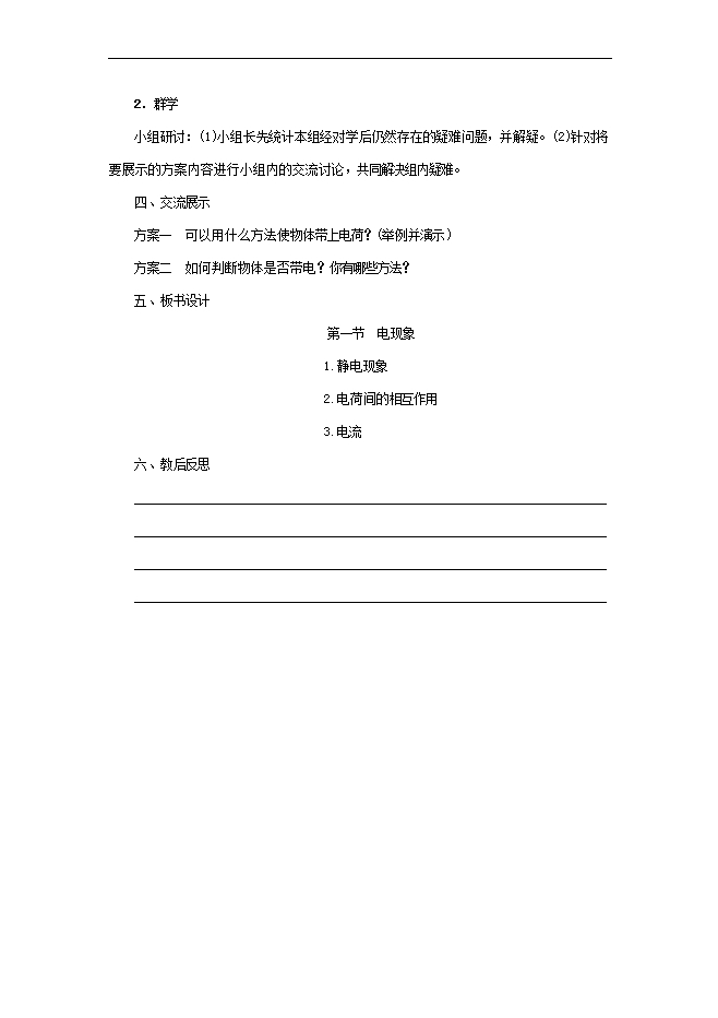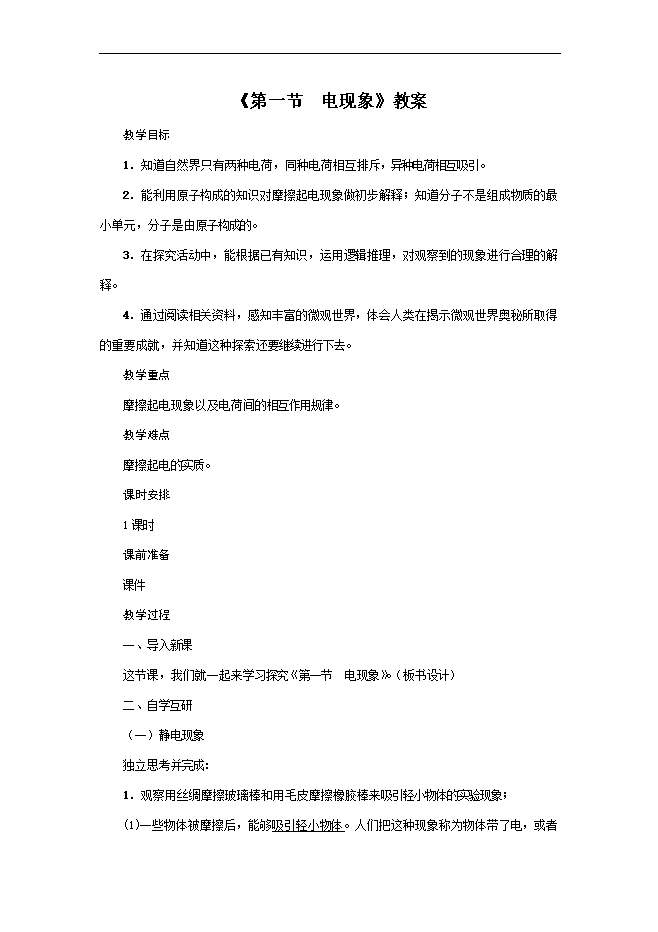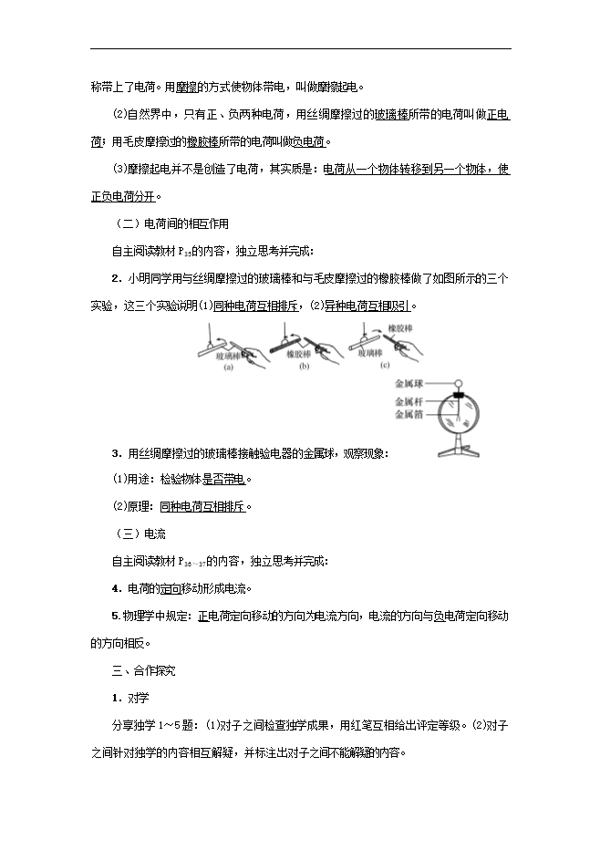 【内容简介】教学目标1.知道自然界只有两种电荷,同种电荷相互排斥,异种电荷相互吸引。2.能利用原子构成的知识对摩擦起电现象做初步解释;知道分子不是组成物质的最小单元,分子是由原子构成的。3.在探究活动中,能根据已有知识,运用逻辑推理,对观察到的现象进行合理的解释。4.通过阅读相关资料,感知丰富的微观世界,体会人类在揭示微观世界奥秘所取得的重要成就,并知道这种探索还要继续进行下去。教学重点摩擦起电现象以及电荷间的相互作用规律。教学难点摩擦起电的实质。课时安排1课时课前准备课件教学过程一、导入新课这节课,我们就一起来学习探究《第一节 电现象》。(板书设计)二、自学互研(一)静电现象独立思考并完成:1.观察用丝绸摩擦玻璃棒和用毛皮摩擦橡胶棒来吸引轻小物体的实验现象;(1)一些物体被摩擦后,能够吸引轻小物体。人们把这种现象称为物体带了电,或者称带上了电荷。用摩擦的方式使物体带电,叫做摩擦起电。(2)自然界中,只有正、负两种电荷,用丝绸摩擦过的玻璃棒所带的电荷叫做正电荷;用毛皮摩擦过的橡胶棒所带的电荷叫做负电荷。(3)摩擦起电并不是创造了电荷,其实质是:电荷从一个物体转移到另一个物体,使正负电荷分开。(二)电荷间的相互作用自主阅读教材P35的内容,独立思考并完成:2.小明同学用与丝绸摩擦过的玻璃棒和与毛皮摩擦过的橡胶棒做了如图所示的三个实验,这三个实验说明(1)同种电荷互相排斥,(2)异种电荷互相吸引。 3.用丝绸摩擦过的玻璃棒接触验电器的金属球,观察现象: (1)用途:检验物体是否带电。(2)原理:同种电荷互相排斥。(三)电流自主阅读教材P36~37的内容,独立思考并完成:4.电荷的定向移动形成电流。5.物理学中规定:正电荷定向移动的方向为电流方向,电流的方向与负电荷定向移动的方向相反。三、合作探究1.对学分享独学1~5题:(1)对子之间检查独学成果,用红笔互相给出评定等级。(2)对子之间针对独学的内容相互解疑,并标注出对子之间不能解疑的内容。