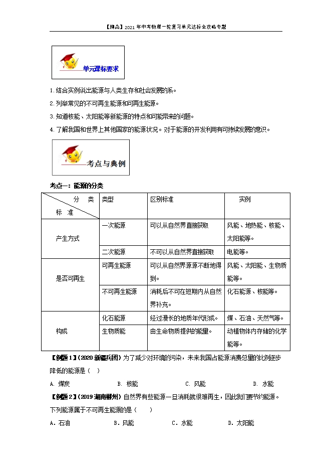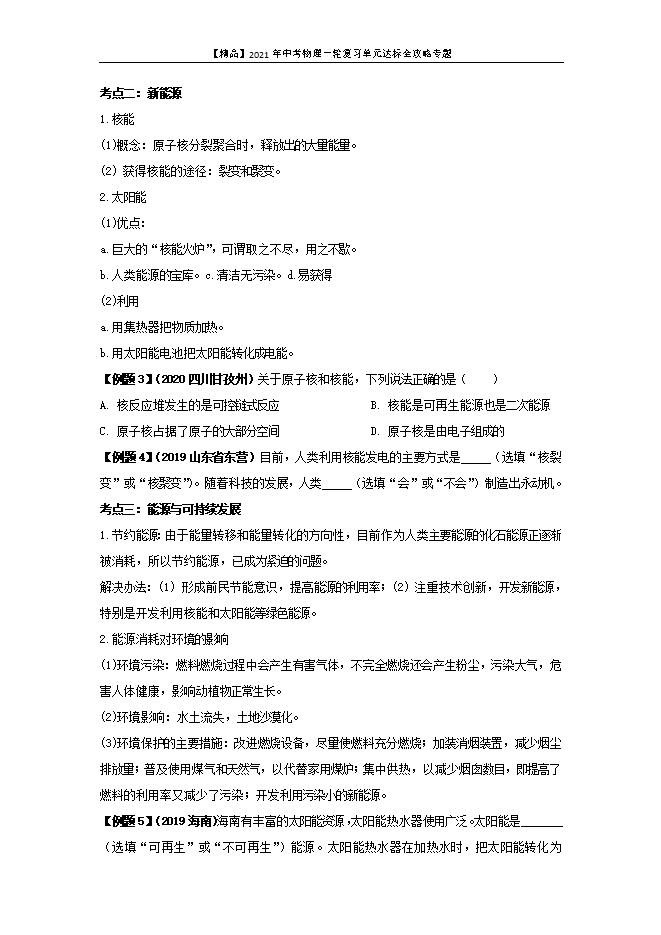 【内容简介】1.结合实例说出能源与人类生存和社会发展的系。2.列举常见的不可再生能源和可再生能源。3.知道核能、太阳能等新能源的特点和可能带来的问题。4.了解我国和世界上其他国家的能源状况。对于能源的开发利用有可持续发展的意识。 考点一:能源的分类 分 类标 准类型区别标准实例产生方式一次能源可以从自然界直接获取风能、地热能、核能、太阳能等。二次能源不可以从自然界直接获取电能等。是否可再生可再生能源可以从自然界源源不断地得到。风能、太阳能、生物质能等。不可再生能源消耗后不可在短期内从自然界补充。化石能源、核能等。构成化石能源经过漫长的地质年代形成。煤、石油、天然气等。生物质能由生命物质提供的能量。动植物体内存储的化学能等。【例题1】(2020新疆兵团)为了减少对环境的污染,未来我国占能源消费总量的比例逐步降低的能源是( )A. 煤炭B. 核能C. 风能D. 水能【答案】A【解析】煤炭中含有硫、磷、氟、氯等是煤炭中的有害成分,其中以硫最为重要。煤炭燃烧时绝大部分的硫被氧化成二氧化硫(SO2),随烟气排放,污染大气,危害动、植物生长及人类健康,腐蚀金属设备。核能发电不像化石燃料发电那样排放巨量的污染物质到大气中,因此核能发电不会造成空气污染。风能、水能属于清洁能源,故A符合题意;BCD不符合题意。【例题2】(2019湖南郴州)自然界有些能源一旦消耗就很难再生,因此我们要节约能源。下列能源属于不可再生能源的是( )A.石油B.风能C.水能D.太阳能【答案】A【解析】太阳能、水能、风能等在短时间内可以再次产生,是可再生能源,化石能源是短时间内不能再次产生的,是不可再生能源,故A符合题意。考点二:新能源1.核能(1)概念:原子核分裂聚合时,释放出的大量能量。(2) 获得核能的途径:裂变和聚变。2.太阳能(1)优点:a.巨大的“核能火炉”,可谓取之不尽,用之不歇。b.人类能源的宝库。c.清洁无污染。d.易获得 (2)利用a.用集热器把物质加热。b.用太阳能电池把太阳能转化成电能。【例题3】(2020四川甘孜州)关于原子核和核能,下列说法正确的是( )A. 核反应堆发生的是可控链式反应B. 核能是可再生能源也是二次能源C. 原子核占据了原子的大部分空间D. 原子核是由电子组成的【答案】A【解析】A.核反应堆,是核的裂变,是可控的链式反应,故A正确;B.核能是不可再生能源也是一次能源,故B错误;C.原子核居于原子的中内,占原子很小的空间,故C错误;D.原子核是由质子和中子组成的,故D错误。【例题4】(2019山东省东营)目前,人类利用核能发电的主要方式是 (选填“核裂变”或“核聚变”)。随着科技的发展,人类 (选填“会”或“不会”)制造出永动机。【答案】核裂变;不会。【解析】由于核裂变是可控的,故核电站中的核反应堆就是通过核裂变过程中释放核能带动发电机发电的;据能量的转化和守恒定律知,由于能量的转化或转移具有方向性,人类是无法制成永动机的。考点三:能源与可持续发展1.节约能源:由于能量转移和能量转化的方向性,目前作为人类主要能源的化石能源正逐渐被消耗,所以节约能源,已成为紧迫的问题。解决办法:(1) 形成前民节能意识,提高能源的利用率;(2) 注重技术创新,开发新能源,特别是开发利用核能和太阳能等绿色能源。2.能源消耗对环境的影响