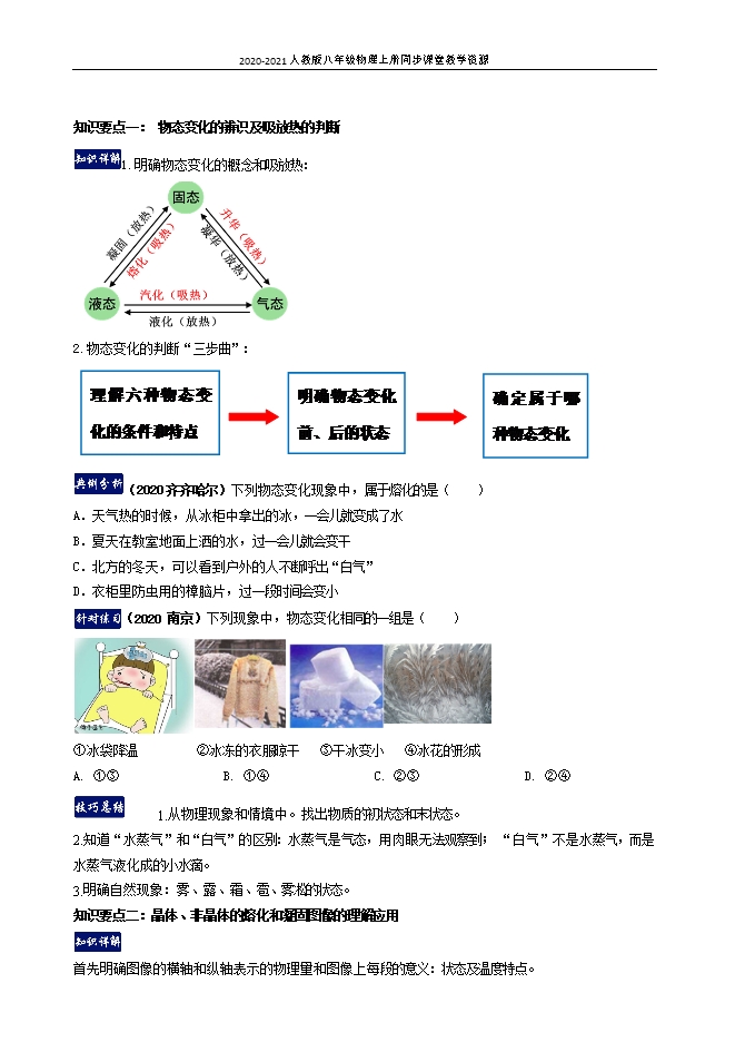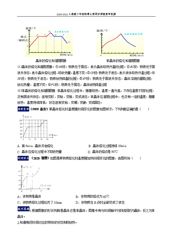 【内容简介】知识要点一: 物态变化的辨识及吸放热的判断 1.明确物态变化的概念和吸放热: 2.物态变化的判断“三步曲”: (2020齐齐哈尔)下列物态变化现象中,属于熔化的是( )A.天气热的时候,从冰柜中拿出的冰,一会儿就变成了水B.夏天在教室地面上洒的水,过一会儿就会变干C.北方的冬天,可以看到户外的人不断呼出“白气”D.衣柜里防虫用的樟脑片,过一段时间会变小【答案】A【解析】A、天气热的时候,从冰柜中拿出的冰,一会儿就变成了水,是由固态变为液态,属于熔化现象,故A符合题意;B、夏天在教室地面上洒的水,过一会儿就会变干,属于汽化现象,故B不符合题意;C、北方的冬天,可以看到户外的人不断呼出“白气”是空气中水蒸气遇冷液化形成的小水滴,就形成了我们看到的“白气”,故C不符合题意;D、衣柜里防虫用的樟脑片,过一段时间会变小,是樟脑片直接由固态变为气态的过程,属于升华现象,故D不符合题意。故选:A。 (2020 南京)下列现象中,物态变化相同的一组是( ) ①冰袋降温 ②冰冻的衣服晾干 ③干冰变小 ④冰花的形成A. ①③B. ①④C. ②③D. ②④【答案】C【解析】①冰袋降温,是物质由固态变成液态的过程,属于熔化现象;②冰冻的衣服晾干,是冰吸收热量变成水蒸气,属于升华现象;③干冰变小,是干冰由固态变成气态的过程,属于升华现象;④冰花的形成,是水蒸气变成冰晶,属于凝华现象;物态变化相同的一组是②③。故选C。 1.从物理现象和情境中。找出物质的初状态和末状态。2.知道“水蒸气”和“白气”的区别:水蒸气是气态,用肉眼无法观察到; “白气”不是水蒸气,而是水蒸气液化成的小水滴。3.明确自然现象:雾、露、霜、雹、雾凇的状态。知识要点二:晶体、非晶体的熔化和凝固图像的理解应用 首先明确图像的横轴和纵轴表示的物理量和图像上每段的意义:状态及温度特点。 晶体的熔化和凝固图像 非晶体的熔化和凝固图像(1)晶体的熔化和凝固图象:①AB段:物质处于固态,表示晶体吸热升温的过程。②BC段:物质处于固液共存态,表示晶体熔化过程,吸收热量,温度不变。③CD段:物质处于液态,表示液体吸热升温过程。④DE段:物质处于液态,物质放热降温的过程。⑤EF段:物质处于固液共存态,晶体溶液的凝固过程,放出热量,温度不变。⑥FG段:物质处于固态,晶体放热降温过程(2)非晶体的熔化和凝固图像:非晶体熔化过程中,随着吸热,温度一直升高,不存在温度不变的过程,没有固液共存态,逐渐变软、变粘、变稀、变成液态。非晶体在凝固过程中,也没有一定的温度,随着放热,温度持续降低,状态逐渐变粘、变稠、变硬,变成固态。 (2020 泰安)某晶体熔化时温度随时间变化的图象如图所示,下列判断正确的是( ) A. 第5min,晶体开始熔化B. 晶体熔化过程持续20minC. 晶体在熔化过程中不吸收热量D. 晶体的熔点是80℃【答案】D【解析】A.由图可知,第10min,晶体开始熔化,故A错误;B.晶体熔化过程持续的时间:t=25min-10min=15min。故B错误;C.晶体在熔化过程中,不断吸收热量,故C错误;D.由图可知,图象中呈水平的一段所对应的温度80℃就是物质的熔点,所以晶体的熔点是80℃,故D正确.故选D。