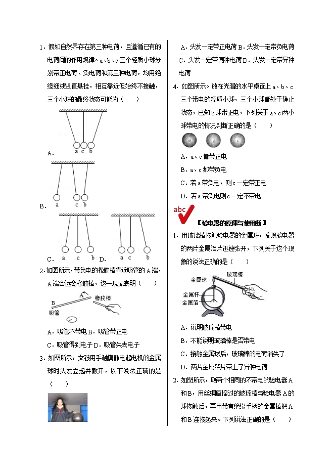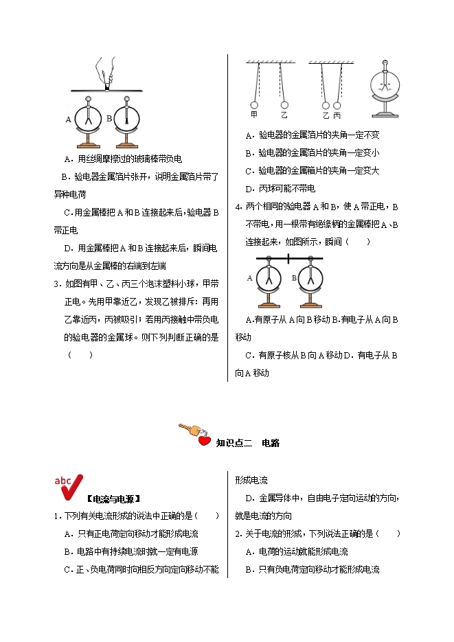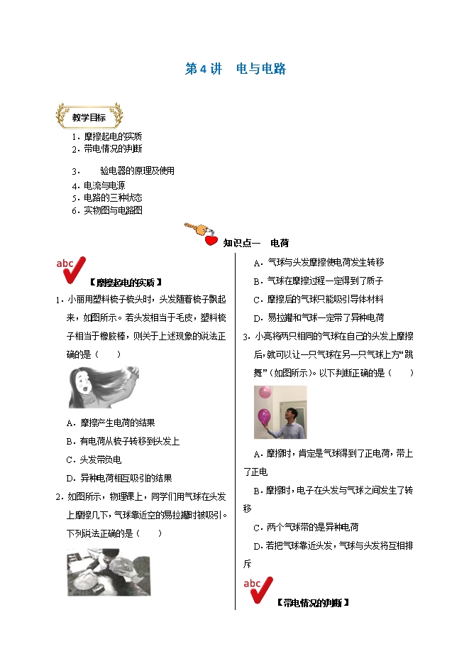 【内容简介】1.摩擦起电的实质2.带电情况的判断3.验电器的原理及使用4.电流与电源5.电路的三种状态6.实物图与电路图 知识点一 电荷 【摩擦起电的实质】1.小丽用塑料梳子梳头时,头发随着梳子飘起来,如图所示。若头发相当于毛皮,塑料梳子相当于橡胶棒,则关于上述现象的说法正确的是( ) A.摩擦产生电荷的结果B.有电荷从梳子转移到头发上C.头发带负电D.异种电荷相互吸引的结果【解答】解:A、摩擦起电的实质是电荷发生了转移,而不是产生电荷的结果,故A错误;B、用塑料梳子梳头发时,塑料梳子与头发相互摩擦,发生了电子的转移,有电荷从头发转移到梳子上,故B错误;C、用塑料梳子梳头发时,塑料梳子与头发相互摩擦,有电荷从头发转移到梳子上,头发带正电,故C错误;D、用塑料梳子梳头发时,梳子与头发摩擦,发生摩擦起电现象,梳子和头发带上异种电荷,异种电荷相互吸引,所以头发会随着梳子飘起来,故D正确。故选:D。2.如图所示,物理课上,同学们用气球在头发上摩擦几下,气球靠近空的易拉罐时被吸引。下列说法正确的是( ) A.气球与头发摩擦使电荷发生转移B.气球在摩擦过程一定得到了质子C.摩擦后的气球只能吸引导体材料D.易拉罐和气球一定带了异种电荷【解答】解:ABD、将气球在头发上摩擦后,头发与气球上的电荷(电子)发生转移,使气球和头发上带上异种电荷,带电的气球可以吸引轻小的不带电的空易拉罐,也可以吸引与气球带电相反的易拉罐,故A正确,BD错误;C、摩擦后的气球既可以吸引导体材料,又可以吸引绝缘体材料,故C错误。故选:A。3.小亮将两只相同的气球在自己的头发上摩擦后,就可以让一只气球在另一只气球上方“跳舞”(如图所示)。以下判断正确的是( ) A.摩擦时,肯定是气球得到了正电荷,带上了正电B.摩擦时,电子在头发与气球之间发生了转移C.两个气球带的是异种电荷D.若把气球靠近头发,气球与头发将互相排斥【解答】解:AB、将两只相同的气球在自己的头发上摩擦时,电子在头发和气球之间发生转移,而使头发与气球带异种电荷,但不能确定气球与头发所带电荷的性质。故A错误、B正确;C、两只相同的气球在头发上摩擦后,两只相同的气球带的是同种电荷,由于同种电荷相互排斥,所以会发现一只气球在另一只气球上方“跳舞”。故C错误;D、头发与气球带异种电荷,而异种电荷相互吸引,所以把气球靠近头发,气球与头发将互相吸引。故D错误。故选:B。