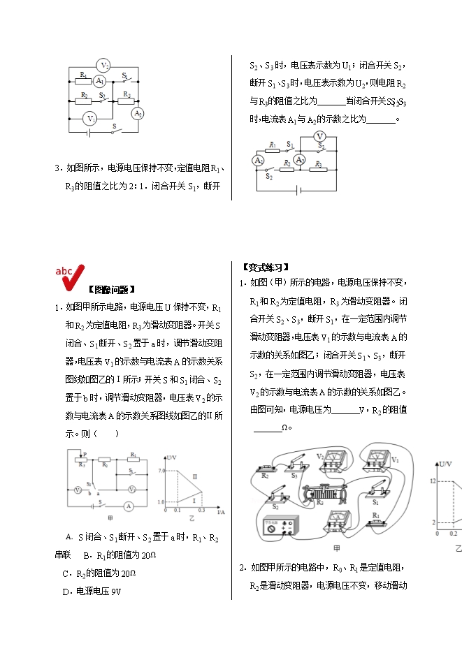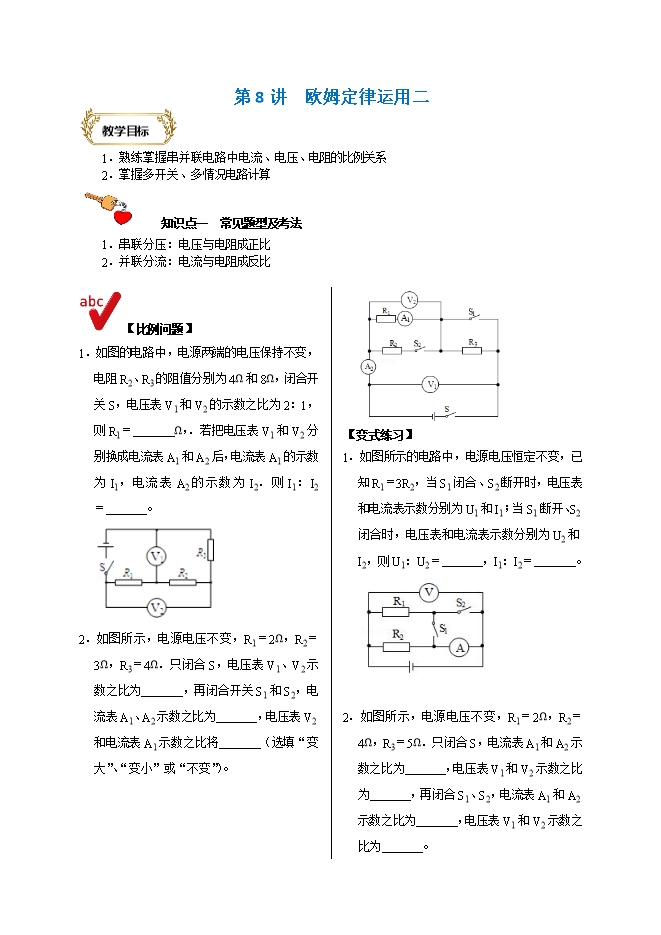 【内容简介】1.熟练掌握串并联电路中电流、电压、电阻的比例关系2.掌握多开关、多情况电路计算 知识点一 常见题型及考法1.串联分压:电压与电阻成正比2.并联分流:电流与电阻成反比 【比例问题】1.如图的电路中,电源两端的电压保持不变,电阻R2、R3的阻值分别为4Ω和8Ω,闭合开关S,电压表V1和V2的示数之比为2:1,则R1= Ω,.若把电压表V1和V2分别换成电流表A1和A2后,电流表A1的示数为I1,电流表A2的示数为I2.则I1:I2= 。 【解答】解:(1)当两表为电压表时,电路图如图所示, 由于串联电路各处的电流相等,根据I= 得U=IR可知,电流表V1和电流表V2的示数之比:U1:U2=I(R2+R3):I(R1+R2)=(R2+R3):(R1+R2)=(4Ω+8Ω):(R1+4Ω)=2:1,解得:R1=2Ω;(2)当两表为电流表时,电路图如图所示, 根据并联电路的电流特点可知:电流表A1的示数为:I1=I′+I″,电流表A2的示数为:I2=I″+I″′,根据I= 可知,I1:I2=( + ):( + )=( + ):( + )=2:1。故答案为:2;2:1。2.如图所示,电源电压不变,R1=2Ω,R2=3Ω,R3=4Ω.只闭合S,电压表V1、V2示数之比为 ,再闭合开关S1和S2,电流表A1、A2示数之比为 ,电压表V2和电流表A1示数之比将 (选填“变大”、“变小”或“不变”)。 【解答】解:(1)只闭合S时,R1与R3串联,电压表V1测电源两端的电压,电压表V2测R1两端的电压,因串联电路中各处的电流相等,且总电阻等于各分电阻之和,所以,由I= 可得,两电压表的示数之比: = = = = ;(2)闭合S、S1、S2时,R1与R2并联,电流表A1测R1支路的电流,电流表A2测干路电流,因并联电路中总电阻的倒数等于各分电阻倒数之和,所以,电路的总电阻:R= = =1.2Ω,因并联电路中各支路两端的电压相等,所以,两电流表的示数之比: = = = = ;(3)只闭合S时和再闭合开关S1和S2后,电压表V2始终测R1两端的电压,电流表A1测通过的电流,由R= 可知,电压表V2和电流表A1示数之比等于R1的阻值,则其比值不变。故答案为:3:1; 3:5; 不变。【变式练习】1.如图所示的电路中,电源电压恒定不变,已知R1=3R2,当S1闭合、S2断开时,电压表和电流表示数分别为U1和I1;当S1断开、S2闭合时,电压表和电流表示数分别为U2和I2,则U1:U2= ,I1:I2= 。【解答】解:(1)当S1闭合、S2断开时,两电阻并联,电流表测并联电路的总电流,电压表测电源电压;当S1断开、S2闭合时,电路连接关系不变,电流表测R2的电流,电压表测电源电压,因电源电压不变,故U1:U2=1:1;
