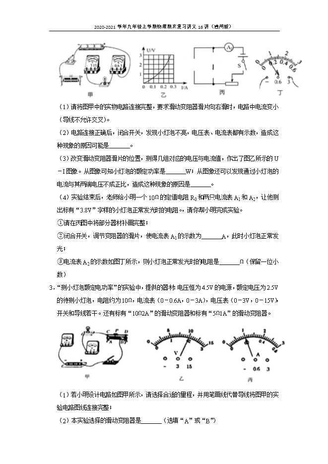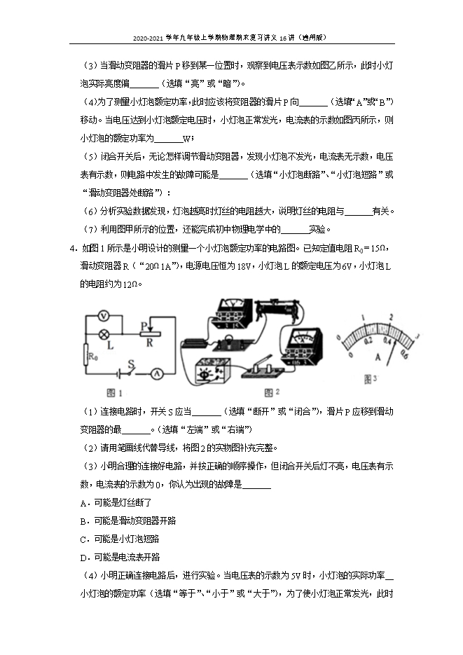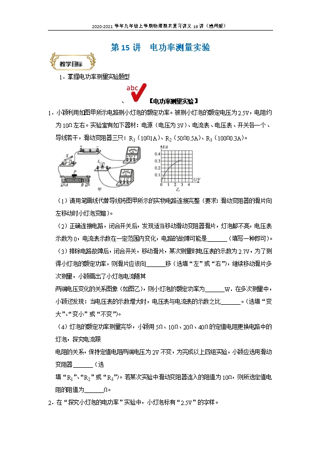 [精品]第15讲 电功率测量实验--2020-2021学年九年级上学期物理期末复习讲义16讲(通用版)