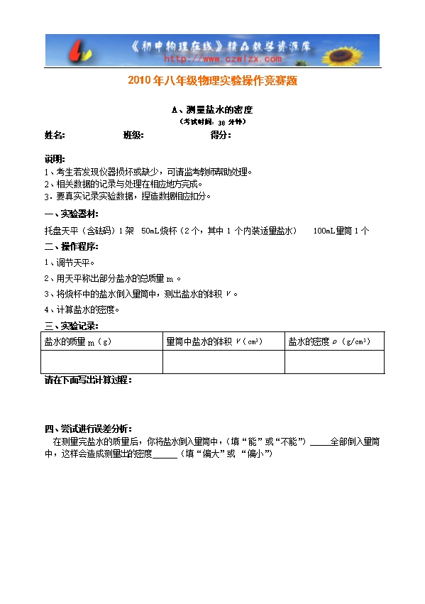 托盘天平(含砝码)1架 50mL烧杯(2个,其中1 个内装适量盐水) 100mL量筒1个