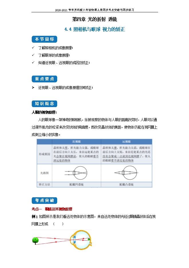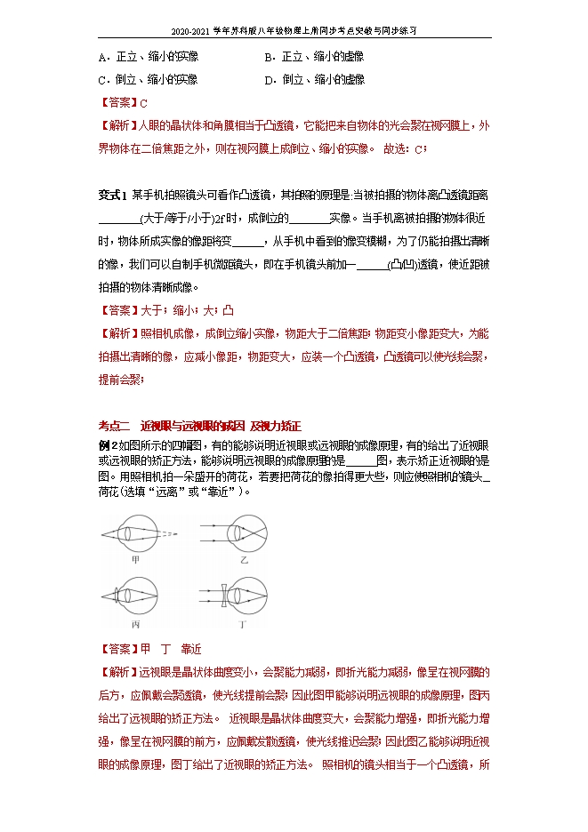 [精品]课时4.4 照相机与眼球 视力的矫正--2020-2021学年苏科版八年级物理上册同步考点突破与同步练习(附解析)