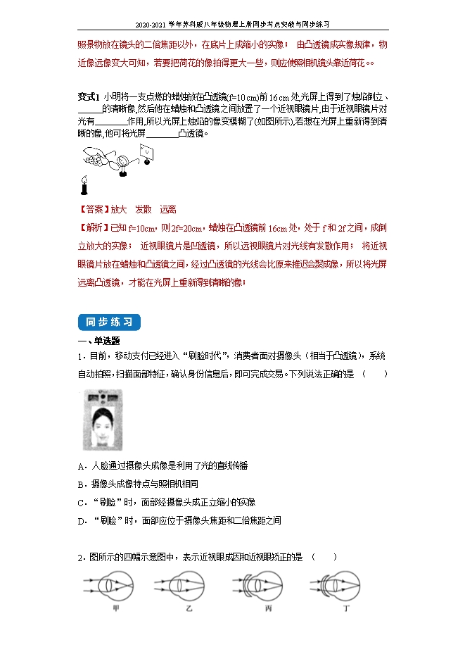 【内容简介】人眼的视物原理:人的眼球像一架神奇的照相机,当被观察的物体与人眼的距离改变时,人眼可以通过调节肌肉的松紧来改变状体的弯曲度,即改变晶状体的焦距,使物体仍能在视网膜上成倒立缩小的实像。 考点一眼睛及其视物原理例1 如图所示是我们看远处物体的示意图,来自远处物体的光经过眼睛晶状体后在视网膜上形成 ( ) A.正立、缩小的实像 B.正立、缩小的虚像 C.倒立、缩小的实像 D.倒立、缩小的虚像【答案】C【解析】人眼的晶状体和角膜相当于凸透镜,它能把来自物体的光会聚在视网膜上,外界物体在二倍焦距之外,则在视网膜上成倒立、缩小的实像。 故选:C;变式1 某手机拍照镜头可看作凸透镜,其拍照的原理是:当被拍摄的物体离凸透镜距离 (大于/等于/小于)2f时,成倒立的 实像。当手机离被拍摄的物体很近时,物体所成实像的像距将变 ,从手机中看到的像变模糊,为了仍能拍摄出清晰的像,我们可以自制手机微距镜头,即在手机镜头前加一 (凸/凹)透镜,使近距被拍摄的物体清晰成像。【答案】大于;缩小;大;凸【解析】照相机成像,成倒立缩小实像,物距大于二倍焦距;物距变小像距变大,为能拍摄出清晰的像,应减小像距,物距变大,应装一个凸透镜,凸透镜可以使光线会聚,提前会聚;考点二近视眼与远视眼的成因 及视力矫正例2 如图所示的四幅图,有的能够说明近视眼或远视眼的成像原理,有的给出了近视眼或远视眼的矫正方法,能够说明远视眼的成像原理的是 图,表示矫正近视眼的是 图。用照相机拍一朵盛开的荷花,若要把荷花的像拍得更大些,则应使照相机的镜头 荷花(选填“远离”或“靠近”)。 【答案】甲 丁 靠近【解析】远视眼是晶状体曲度变小,会聚能力减弱,即折光能力减弱,像呈在视网膜的后方,应佩戴会聚透镜,使光线提前会聚;因此图甲能够说明远视眼的成像原理,图丙给出了远视眼的矫正方法。 近视眼是晶状体曲度变大,会聚能力增强,即折光能力增强,像呈在视网膜的前方,应佩戴发散透镜,使光线推迟会聚;因此图乙能够说明近视眼的成像原理,图丁给出了近视眼的矫正方法。 照相机的镜头相当于一个凸透镜,所照景物放在镜头的二倍焦距以外,在底片上成缩小的实像; 由凸透镜成实像规律,物近像远像变大可知,若要把荷花的像拍得更大一些,则应使照相机镜头靠近荷花。。变式1 小明将一支点燃的蜡烛放在凸透镜(f=10 cm)前16 cm处,光屏上得到了烛焰倒立、 的清晰像,然后他在蜡烛和凸透镜之间放置了一个近视眼镜片,由于近视眼镜片对光有 作用,所以光屏上烛焰的像变模糊了(如图所示),若想在光屏上重新得到清晰的像,他可将光屏 凸透镜。 【答案】放大 发散 远离【解析】已知f=10cm,则2f=20cm,蜡烛在凸透镜前16cm处,处于f和2f之间,成倒立放大的实像; 近视眼镜片是凹透镜,所以远视眼镜片对光线有发散作用; 将近视眼镜片放在蜡烛和凸透镜之间,经过凸透镜的光线会比原来推迟会聚成像,所以将光屏远离凸透镜,才能在光屏上重新得到清晰的像; 一、单选题1.目前,移动支付已经进入“刷脸时代”,消费者面对摄像头(相当于凸透镜),系统自动拍照,扫描面部特征,确认身份信息后,即可完成交易。下列说法正确的是 ( ) A.人脸通过摄像头成像是利用了光的直线传播B.摄像头成像特点与照相机相同C.“刷脸”时,面部经摄像头成正立缩小的实像D.“刷脸”时,面部应位于摄像头焦距和二倍焦距之间