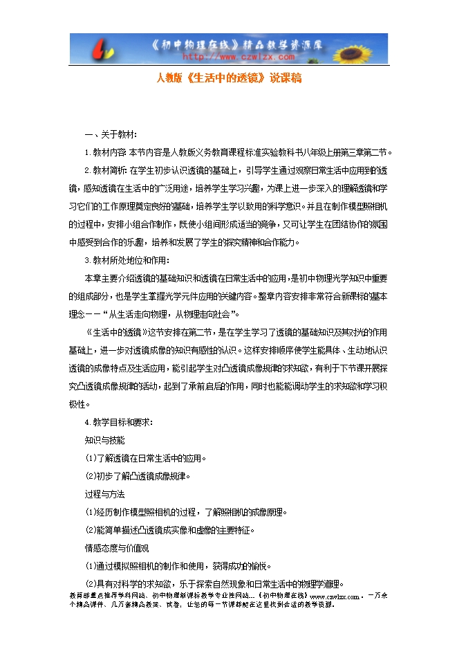 《生活中的透镜》这节安排在第二节,是在学生学习了透镜的基础知识及其对光的作用基础上,进一步对透镜成像的知识有感性的认识。这样安排顺序使学生能具体、生动地认识透镜的成像特点及生活应用,能引起学生对凸透镜成像规律的求知欲,有利于下节课开展探究凸透镜成像规律的活动,起到了承前启后的作用,同时也能能调动学生的求知欲和学习积极性。
