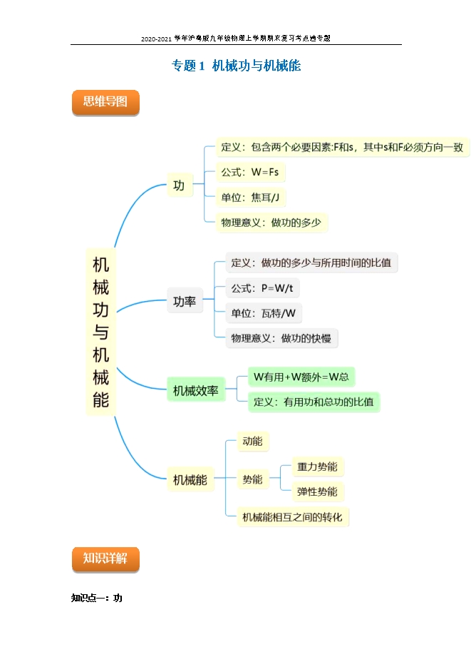 [精品]2020-2021学年沪粤版九年级物理上学期期末复习考点通专题:1 机械功与机械能(原卷版和解析版)