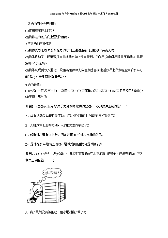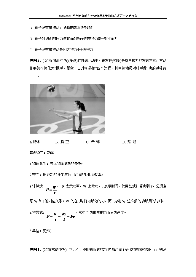 【内容简介】知识点一:功1.做功的两个必要因素:(1)作用在物体上的力;(2)物体在力的方向上通过的距离。2.不做功的三种情况(1)物体受力,但物体没有在力的方向上通过距离。此情况叫“劳而无功”。(2)物体移动了一段距离,但在此运动方向上没有受到力的作用(如物体因惯性而运动)。此情况叫“不劳无功”。(3)物体既受到力,又通过一段距离,但两者方向互相垂直(如起重机吊起货物在空中沿水平方向移动)。此情况叫“垂直无功”。3.功的计算:(1)公式:一般式 W=Fs ;常用式 W=Gh(克服重力做功)或W=f阻s(克服摩擦阻力做功)。(2)单位:焦耳(J)典例1.(2020•大冶月考)关于力对物体做功的叙述,下列说法中正确的是( )A.举重运动员举着杠铃不动,运动员竖直向上托举的力对杠铃做了功 B.人推汽车但没有推动,人的推力对汽车做了功 C.起重机吊着重物上升,钢绳竖直向上的拉力对重物做了功 D.足球在水平地面上滚动,足球受到的重力对足球做了功 【答案】C【解析】A.运动员举着杠铃不动,有力但是没有在力的方向上移动距离,所以没有做功,故A错误;B.人推车,车没动,有力的作用,但是没有在力的方向上移动距离,所以没有做功,故B错误;C.起重机吊着重物上升,钢丝对重物有向上的拉力,同时重物在力的作用下沿力的方向移动了距离,所以做功了,故C正确;D.足球在水平地面上滚动,足球受重力的作用,但是并没有在重力的方向上移动距离,所以重力没有对足球做功,故D错误。故选C。典例2.(2020•永州中考)如图,小明水平向右推放在水平地面上的箱子,但没有推动,下列说法正确的是( ) A. 箱子虽然没有被推动,但小明对箱子做了功 B. 箱子没有被推动,选择的参照物是地面C. 箱子对地面的压力与地面对箱子的支持力是一对平衡力 D. 箱子没有被推动是因为推力小于摩擦力【答案】B 【解析】A.箱子虽然受到力的作用但是没有在力的方向上通过距离,所以小明对箱子没有做功, 故A错误;B.箱子相对于地面位置没有变化,所以以地面为参照物,箱子是静止,因此箱子没有被推动可以选择的参照物是地面,故B正确;C.箱子对地面的压力作用在地面上,地面对箱子的支持力作用在箱子上,两个力是一对相互作用力,而不是平衡力,故C错误;D.箱子没有被推动,箱子处于平衡状态,受到的是一对平衡力,所以推力和摩擦力大小相等,故D错误。故选B。典例3.( 2020 株洲中考)(多选)在排球运动中,跳发球(如图)是最具威力的发球方式,其动作要领可简化为“抛球、腾空、击球和落地”四个过程,其中运动员对排球做 功的过程有 ( ) A.抛球 B. 腾 空 C. 击 球 D. 落 地【答案】AC【解析】做功的必要因素是有力和在力的方向上通过的距离,产生力的条件必须是物体对物体作用,也就是必须要有相互作用. “腾空”和“落地”时,运动员与球并没有接触,没有力的作用.“抛球”和“击球”的一瞬间,运动员对排球有力的作用,同时在力的方向排球有一定的距离,做了功。故选 AC。知识点二:功率1.物理意义:表示物体做功的快慢。2.定义:把做功的多少与所用时间的比叫做功率。3.计算式: , P 表示功率,W 表示功,t 表示时间,使用公式计算功率时,必须注意W 和t的对应关系。W 为在t时间内所做的功,而t为做W 这么多的功所用的时间。4.推导式: ,式中F为做功的力而v为速度。5.单位:瓦(W)典例4.(2020常德中考) 甲、乙两种机械所做的功W随时间t变化的图像如图所示,则从图像可以判断( )