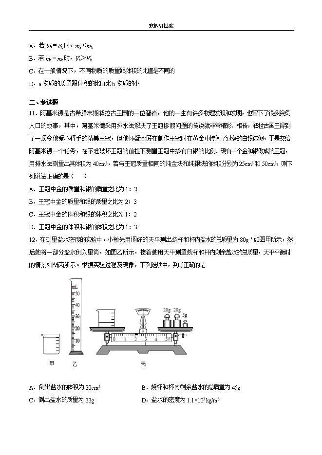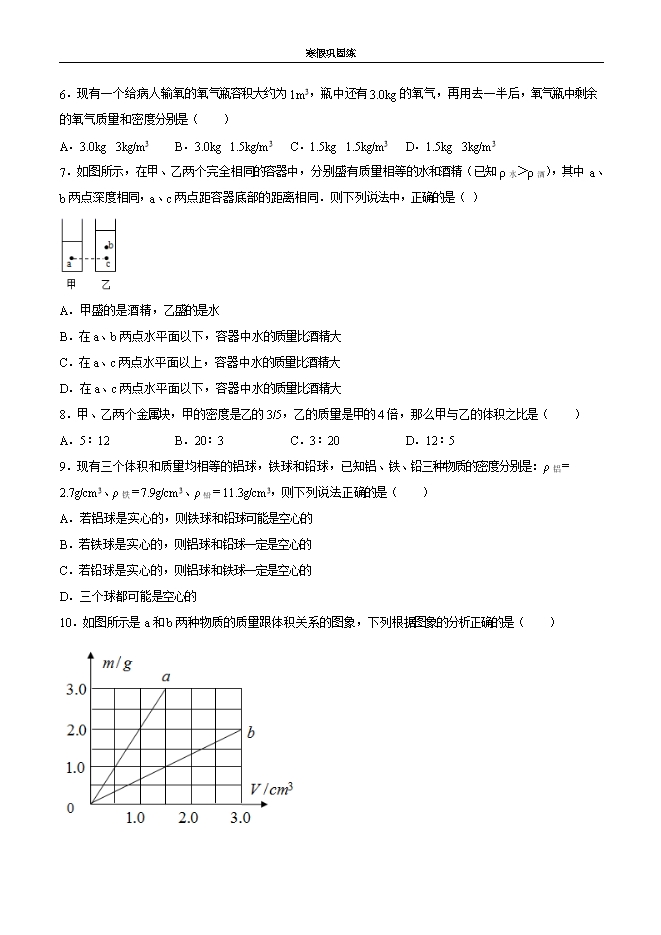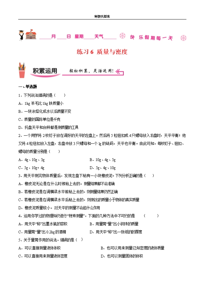 【寒假作业】巩固练06 质量与密度--2020-2021学年沪科版八年级物理上学期寒假作业