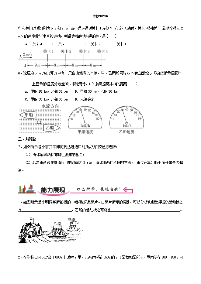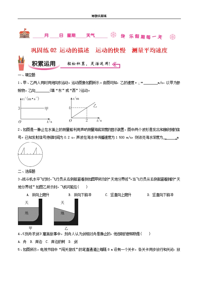 【内容简介】1、甲、乙两人同时同地向东运动,运动图象如图所示。由图可知,乙的速度v乙=________m/s,以甲为参照物,乙向________(填“东”或“西”)运动。 解析:根据公式计算出乙的速度为2m/s,甲的速度为3m/s,以甲为参照物,乙向西运动。所以答案为2;西。2、如图是一静止在水面上的测量船利用声呐测量海底深度的显示装置,图中两个波形是发出和接收到的信号。已知发射信号持续时间为0.2 s,声波在海水中传播速度为1 500 m/s,则该处海水深度为__ _m解析:从图中可以看出,声信号从开始发出后经过了0.8s被船重新接收,由v=s/t得声波传播的距离s=vt=1 500m/s×0.8s=1 200m,海底的深度h=1/2s=1/2×1 200 m=600m。所以答案为600m。二、选择题3、战斗机水平飞行时,飞行员从右侧舷窗看到如图甲所示的“天地分界线”。当飞行员从右侧舷窗看到的“天地分界线”如图乙所示时,飞机可能在( ) A. 斜向上爬升 B. 斜向下俯冲 C. 竖直向上爬升 D. 竖直向下俯冲 解析:当战斗机斜向上爬升时,飞行员以飞机为参照物时,将看到右侧舷窗看到的“天地分界线”左低右高,倾斜向下,故A错误;当战斗机斜向下俯冲时,飞行员以飞机为参照物时,将看到右侧舷窗看到的“天地分界线”左高右低,倾斜向上,如图乙所示时,故B正确;当战斗机竖直向上爬升,飞行员以飞机为参照物时,将看到右侧舷窗看到的“天地分界线”还是水平的,且与飞机的距离越来越远,故C错误;当战斗机向下俯冲时,飞行员以飞机为参照物时,将看到右侧舷窗看到的“天地分界线”还是水平的,且与飞机的距离越来越近,故D错误;也可以这样解答,不管战斗机如何飞行,“天地分界线”始终是水平的,可旋转书本,将乙图中的“天地分界线”调至水平位置,此时飞机左侧(机头方向)向下倾斜。所以答案为B4、《刻舟求剑》寓言故事中,刻舟人认为剑相对舟是静止的,他选取的参照物是( )A. 舟 B. 岸边 C. 岸边的树 D. 剑解析:故事中,刻舟之人以舟为参照物,他认为剑相对于舟的位置变化是静止的,实际上掉到江里的剑和舟之间发生了位置的变化,剑相对于舟是运动的,所以无法通过“刻舟”而求得剑。答案为A。5、如图所示,电视节目中“闯关游戏”的笔直通道上每隔8 m设有一个关卡,各关卡同步放行和关闭,放行和关闭时间分别为5 s和2 s,当小强正通过关卡1左侧9 m远的A处时,关卡刚好放行,若他全程以2 m/s的速度做匀速直线运动,则最先挡住他前进的关卡是( ) A. 关卡4 B. 关卡3 C. 关卡2 D. 关卡1 解析:由题知,关卡放行和关闭时间分别为5 s和2 s,小强正通过A处时,关卡刚好放行,由v=s/t可得,小强到达关卡1时所用的时间t1=s_1/v=9 m/(2 m/s)=4.5 s<5 s,所以关卡1不会挡住他;每两个关卡间距离8 m,所以小强通过相邻两关卡所用的时间t=s^'/v=8 m/(2 m/s)=4 s,小强到达关卡2的时间t2=t1+t=4.5 s+4 s=8.5 s,5 s+2 s<t2<5 s+2 s+5 s,所以关卡2不会挡住他;小强到达关卡3的时间t3=t2+t=8.5 s+4 s=12.5 s,5 s+2 s+5 s<t3<5 s+2 s+5 s+2 s,所以关卡3会最先挡住他。所以答案为B