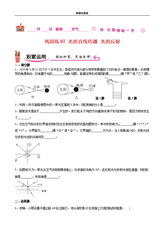 【寒假作业】巩固练07 光的直线传播 光的反射--2020-2021学年人教版八年级物理上学期寒假作业