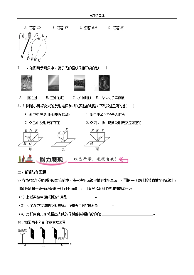 【内容简介】1、2020年6月21日下午3点半左右,娄底市内绝大部分同学亲眼看到了日环食这一难得的景象。从物理学的角度来说,日食属于光的________现象;如图,能描述其形成原因的是________(填“甲”或“乙”)图。 第1题 第2题解析:略 答案为 直线传播 甲2、利用一块平面镜使图中的一束光竖直射入井中,则反射角的大小是________。解析:解析:由于反射光线竖直射入井内,过入射点O竖直向下做出反射光线OB;然后作∠AOB的角平分线即为法线(ON)。由图知:反射光线和入射光线的夹角∠AOB=20°+90°=110°;则反射角∠BON=1/2∠AOB=1/2×110°=55°,如图所示。 3、粼粼波光是由于______________产生的。我们能从不同的方向看到本身不发光的物体,是因为物体发生了________。解析; 略 答案为光的镜面反射 漫反射4、光在空气和水的分界面处同时发生反射和折射的光路如图所示,其中折射角为∠________(填“1”“2”或“3”),分界面为________(填“①”或“②”),分界面的________方为水,当入射角减小时,反射光线与折射光线的夹角将变________。 解析:图中的∠1和∠3相等,且共边相邻,根据反射时,反射角与入射角相等,且都是与法线的夹角,确定法线是图中的①;则分界面是②;根据OA和OB在法线同侧,说明CO是入射光线,OB是折射光线,折射角为折射光线与法线的夹角,即∠2;由于折射角大于入射角,因而是从水中斜射入空气中,即下方是空气,上方是水;入射角减小,无论折射角大于还是小于入射角,折射角都是跟着减小,反射角也减小,即∠1和∠2减小,∠AOB增大,即反射光线和折射光线的夹角增大。答案为 2 ② 上 大5、如图所示为一束光从空气斜射到某液面上,与液面的夹角为30°,且反射光与折射光相互垂直,则反射角是 ,折射角是 。 解析:如题图所示,入射光线与液面的夹角是30°,所以入射角为90°-30°=60°。反射角等于入射角也为60°,所以反射光线与液面的夹角为30°。因为折射光线与反射光线垂直,所以折射光线与液面的夹角为90°-30°=60°,因此折射角为90°-60°=30°。答案为 60° 30°。二、选择题6、夜晚,小明沿着平直公路AB经过路灯,他头部的影子在地面上行进的轨迹可能是( ) A. 沿着CD B. 沿着EF C. 沿着GH D. 沿着JK