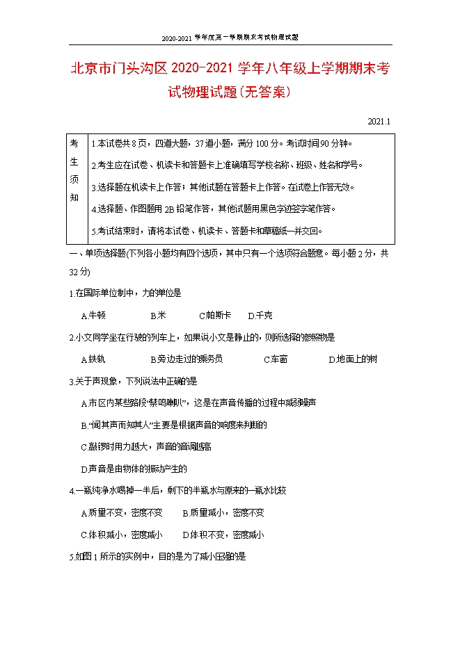北京市门头沟区2020-2021学年八年级上学期期末考试物理试题(无答案)