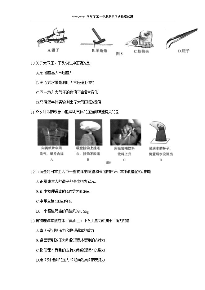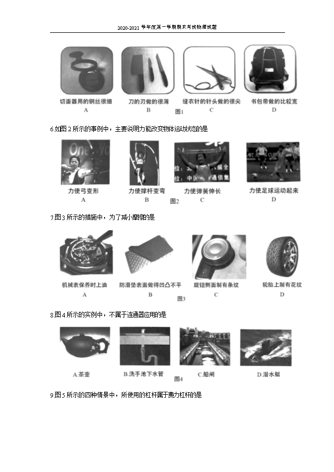 【内容简介】1.在国际单位制中,力的单位是A.牛顿B.米C.帕斯卡D.千克2.小文同学坐在行驶的列车上,如果说小文是静止的,则所选择的参照物是A.铁轨B.旁边走过的乘务员C.车窗D.地面上的树3.关于声现象,下列说法中正确的是A.市区内某些路段“禁鸣喇叭”,这是在声音传播的过程中减弱噪声B.“闻其声而知其人”主要是根据声音的响度来判断的C.敲锣时用力越大,声音的音调越高D.声音是由物体的振动产生的4.一瓶纯净水喝掉一半后,剩下的半瓶水与原来的一瓶水比较A.质量不变,密度不变B.质量减小,密度不变C.体积减小,密度减小D.体积不变,密度减小5.如图1所示的实例中,目的是为了减小压强的是 6.如图2所示的事例中,主要说明力能改变物体运动状态的是 7.图3所示的措施中,为了减小摩擦的是 8.图4所示的实例中,不属于连通器应用的是 9.图5所示的四种情景中,所使用的杠杆属于费力杠杆的是 10.关于大气压,下列说法中正确的是A.高度越高大气压越大B.离心式水泵是利用大气压强工作的C.同一地方大气压的数值不会发生变化D.马德堡半球实验测出了大气压强的数值11.图6所示的现象中能说明气体的压强跟流速有关的是 12.下面是对日常生活中一些物体的质量和长度的估计,其中最接近实际的是A.正常成年人的鞋子的长度约为42cmB.初中物理课本的长度约为0.26mC.中学生跑100m约6sD.一个普通鸡蛋的质量约为0.3kg