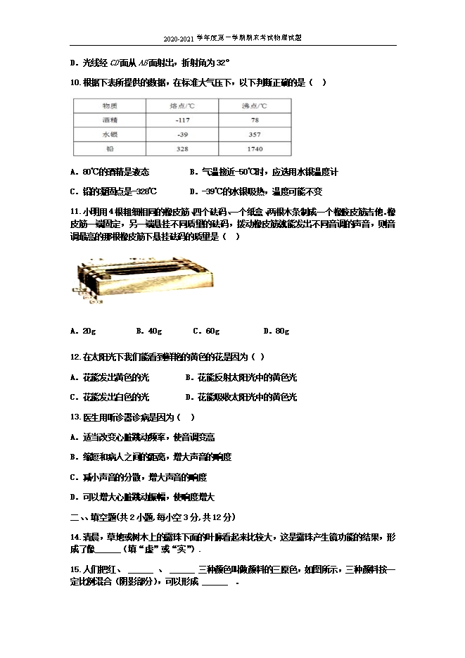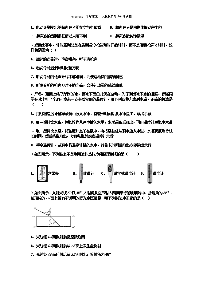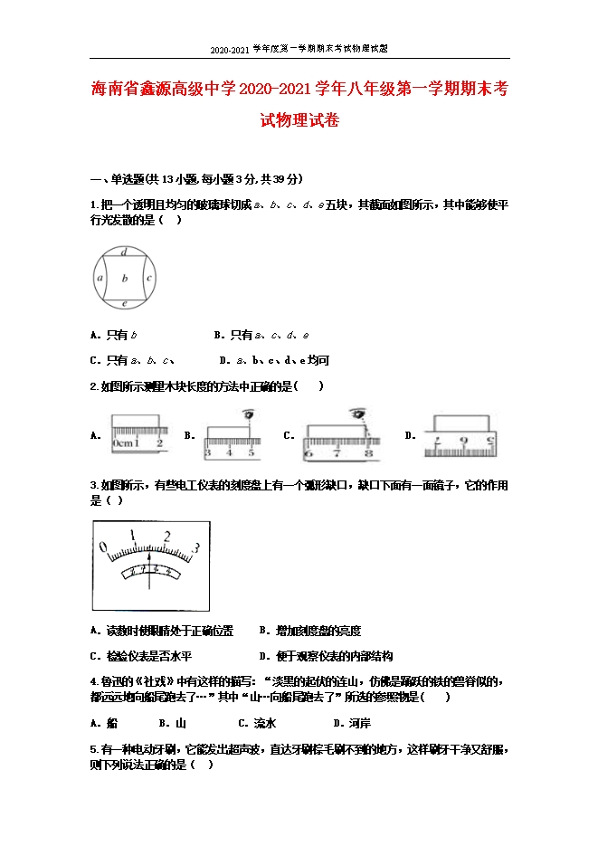 【内容简介】1.把一个透明且均匀的玻璃球切成a、b、c、d、e五块,其截面如图所示,其中能够使平行光发散的是( ) A.只有b B.只有a、c、d、eC.只有a、b、c、 D.a、b、c、d、e均可2.如图所示测量木块长度的方法中正确的是( )A. B. C. D. 3.如图所示,有些电工仪表的刻度盘上有一个弧形缺口,缺口下面有一面镜子,它的作用是( ) A.读数时使眼睛处于正确位置 B.增加刻度盘的亮度C.检验仪表是否水平 D.便于观察仪表的内部结构4.鲁迅的《社戏》中有这样的描写:“淡黑的起伏的连山,仿佛是踊跃的铁的兽脊似的,都远远地向船尾跑去了…”其中“山…向船尾跑去了”所选的参照物是( )A.船 B.山 C.流水 D.河岸5.有一种电动牙刷,它能发出超声波,直达牙刷棕毛刷不到的地方,这样刷牙干净又舒服,则下列说法正确的是( )A.电动牙刷发出的超声波不能在空气中传播 B.超声波不是由物体振动产生的C.超声波的音调很低所以人听不到 D.超声波能传递能量6.短跑比赛中,计时裁判总是在看到发令枪冒烟时开始计时,而不是听到枪声才计时,这样做是因为( )A.离起跑点较远,声音嘈杂,听不清枪声B.看发令枪冒烟计时比较方便C.听发令枪的枪声计时不够准确,会使运动员的成绩偏高D.听发令枪的枪声及时不够准确,会使运动员的成绩偏低7.严冬,湖面上结了厚厚的冰,但冰下面鱼儿仍在游动,为了测出冰下水的温度,徐强同学在冰上打了个洞,拿来一支实验室用的温度计,用下列四种方法测水温,正确的做法是( )A.用线将温度计拴牢从洞中放入水中,待较长时间后从水中提出,读出示数B.取一塑料饮水瓶,将瓶拴住从洞中放入水里,水灌满瓶后取出,再用温度计测瓶中水温C.取一塑料饮水瓶,将温度计悬吊在瓶中,再将瓶拴住从洞中放入水里,水灌满瓶后待较长时间,然后将瓶取出,立即从瓶外观察温度计示数D.手拿温度计,从洞中将温度计插入水中,待较长时间后取出立即读出示数8.如图所示,下列仪表不是利用液体热胀冷缩原理制成的是( )A. 寒暑表 B. 体温计 C. 数字式温度计 D. 温度计9.如图所示,入射光线SO以45°入射角从空气射入两面平行的玻璃砖中,折射角为32°,玻璃砖的CD面上镀有不透明的反光金属薄膜.则下列说法中正确的是( ) A.光线经CD面反射后循原路返回B.光线经CD面反射后从AB面上发生全反射C.光线经CD面反射后从AB面射出,折射角为45°D.光线经CD面从AB面射出,折射角为32°10.根据下表所提供的数据,在标准大气压下,以下判断正确的是( ) A.80℃的酒精是液态 B.气温接近-50℃时,应选用水银温度计C.铅的凝固点是-328℃ D.-39℃的水银吸热,温度可能不变11.小明用4根粗细相同的橡皮筋、四个砝码、一个纸盒、两根木条制成一个橡胶皮筋吉他.橡皮筋一端固定,另一端悬挂不同质量的砝码,拨动橡皮筋就能发出不同音调的声音,则音调最高的那根橡皮筋下悬挂砝码的质量是( )