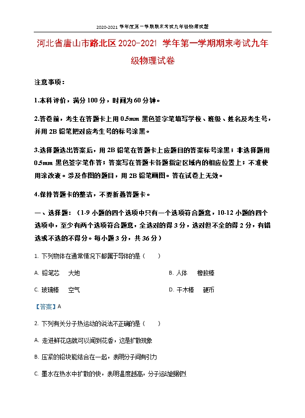 河北省唐山市路北区2020-2021学年第一学期期末考试九年级物理试卷(附答案)