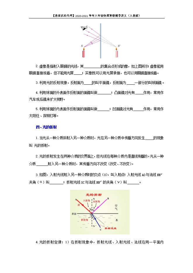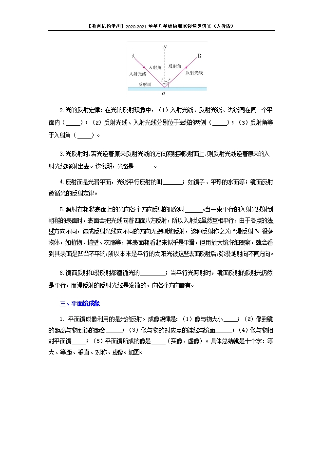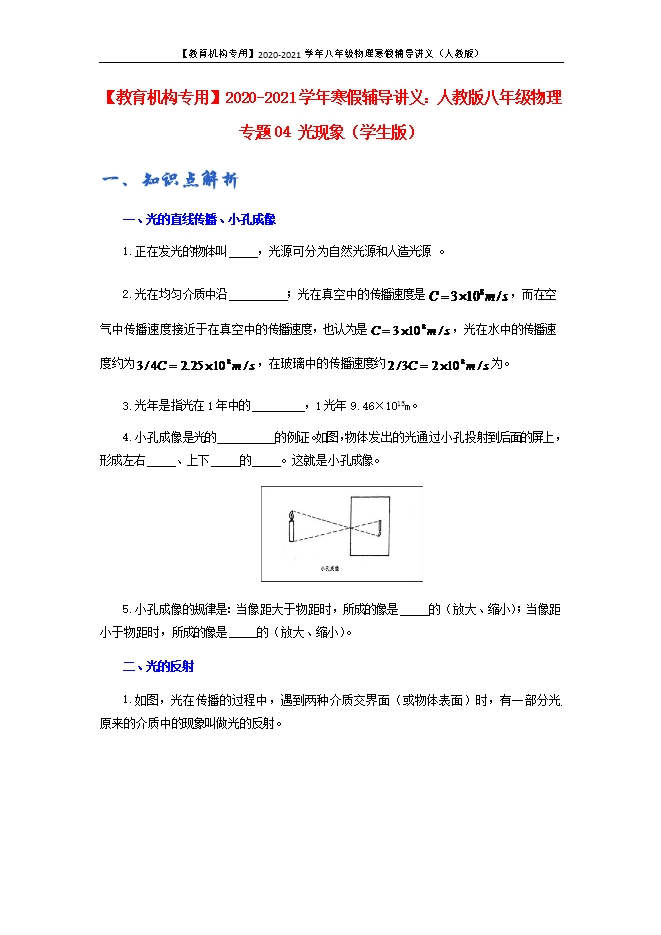 【内容简介】一、知识点解析一、光的直线传播、小孔成像1.正在发光的物体叫光源,光源可分为自然光源和人造光源 。2.光在均匀介质中沿直线传播;光在真空中的传播速度是 ,而在空气中传播速度接近于在真空中的传播速度,也认为是 ,光在水中的传播速度约为 ,在玻璃中的传播速度约 为。3.光年是指光在1年中的传播距离,1光年9.46×1015m。4.小孔成像是光的直线传播的例证。如图,物体发出的光通过小孔投射到后面的屏上,形成左右相反、上下倒置的实像。这就是小孔成像。 5.小孔成像的规律是:当像距大于物距时,所成的像是放大的(放大、缩小);当像距小于物距时,所成的像是缩小的(放大、缩小)。二、光的反射1.如图,光在传播的过程中,遇到两种介质交界面(或物体表面)时,有一部分光返回原来的介质中的现象叫做光的反射。 2.光的反射定律:在光的反射现象中,(1)入射光线、反射光线、法线同在同一个平面内(共面);(2)反射光线、入射光线分别位于法线的两侧(分居);(3)反射角等于入射角(等角)。3.光反射时,若光逆着原来反射光线的方向照射到反射面上,则反射光线逆着原来的入射光线照射出去。这说明,光路是可逆的。4.反射面是光滑平面,光线平行反射的叫镜面反射;如镜子、平静的水面等;镜面反射遵循光的反射定律。5.照射在粗糙表面上的光向各个方向反射的现象叫漫反射。当一束平行的入射光线射到粗糙的表面时,表面会把光线向着四面八方反射,所以入射线虽然互相平行,由于各点的法线方向不同,造成反射光线向不同的方向无规则地反射,这种反射称之为“漫反射”。很多物体,如植物、墙壁、衣服等,其表面粗看起来似乎是平滑,但用放大镜仔细观察,就会看到其表面是凹凸不平的,所以本来是平行的太阳光被这些表面反射后,弥漫地射向不同方向。6.镜面反射和漫反射都遵循光的反射定律;当平行光照射时,镜面反射的反射光仍然是平行,而漫反射的反射光线是发散的,向各个方向都有。三、平面镜成像1. 平面镜成像利用的是光的反射。成像规律是:(1)像与物大小相等;(2)像到镜的距离与物到镜的距离相等;(3)像与物的对应点的连线与镜面垂直;(4)像与物相对平面镜对称;(5)平面镜所成的像是虚像(实像、虚像)。具体总结就是十个字:等大、等距、垂直、对称、虚像。如图。