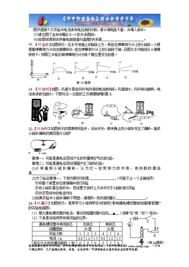 16. 【10金华】如图所示,在水平地面上的磁体上方,有挂在弹簧测力计上的小磁体。小辉提着弹簧测力计向右缓慢移动,挂在弹簧测力计上的小磁体下端,沿图示水平路线从A缓慢移到B。则图乙中能反映弹簧测力计示数F随位置变化的是c