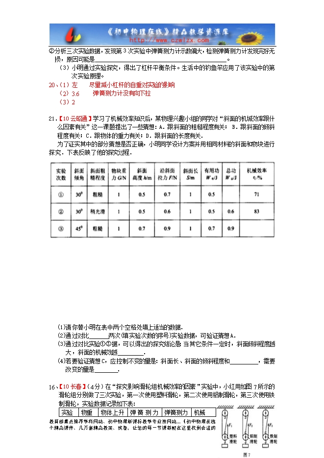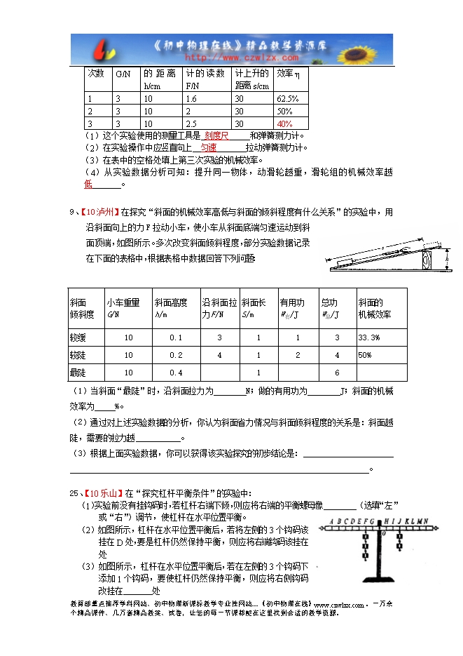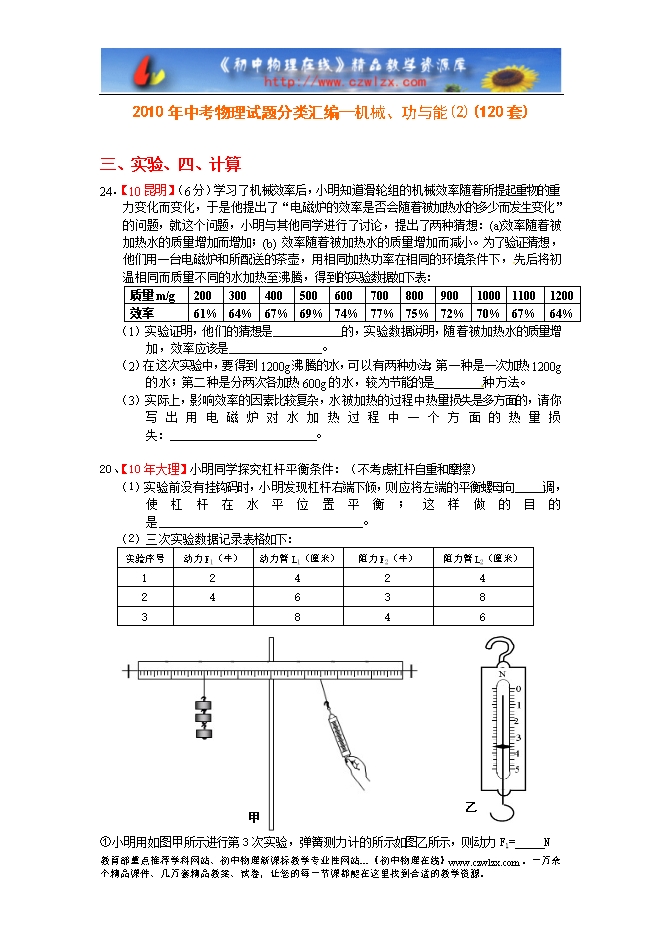 24.【10昆明】(6分)学习了机械效率后,小明知道滑轮组的机械效率随着所提起重物的重力变化而变化,于是他提出了“电磁炉的效率是否会随着被加热水的多少而发生变化”的问题,就这个问题,小明与其他同学进行了讨论,提出了两种猜想:(a)效率随着被加热水的质量增加而增加;(b) 效率随着被加热水的质量增加而减小。为了验证猜想,他们用一台电磁炉和所配送的茶壶,用相同加热功率在相同的环境条件下, 先后将初温相同而质量不同的水加热至沸腾,得到的实验数据如下表: