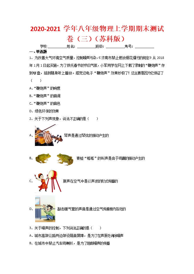 所属专辑: 【精品】2020-2021学年各版本八年级物理上学期期末测试卷
