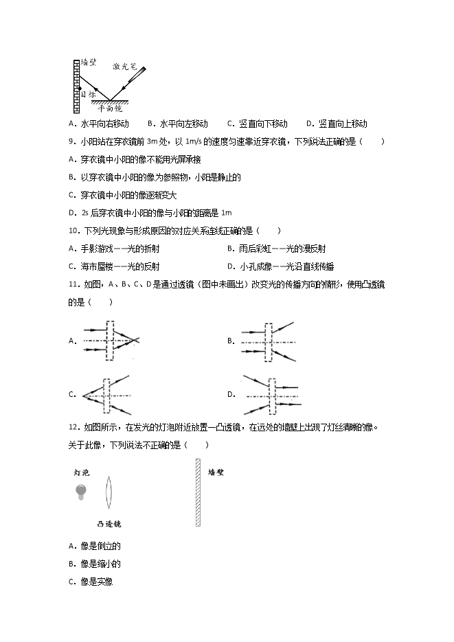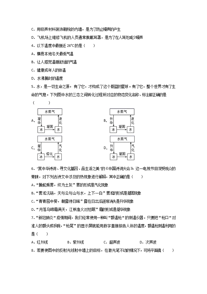 【内容简介】1.为改善大气环境空气质量,控制噪声污染,《济南市禁止燃放烟花爆竹的规定》从2018年1月1日起实施。为了烘托春节的节日气氛,小军同学在网上下载了录制的“鞭炮声”存到 盘,插到随身听上播放。感觉这电子“鞭炮声”效果妙极了!这主要是因为它保证了( )A.“鞭炮声”的响度B.“鞭炮声”的音调C.“鞭炮声”的音色D.绿色环保的效果【答案】C【详解】A.响度是指声音的大小,电子“鞭炮声”保证的是音色与真实的“鞭炮声”声音相同,故A不符合题意;B.音调指的是声音振动的频率,电子“鞭炮声”保证的是音色与真实的“鞭炮声”声音相同,故B不符合题意;C.电子“鞭炮声”保证的是音色与真实的“鞭炮声”声音相同,故C符合题意;D.小军同学为了烘托节日氛围下载电子“鞭炮声”,主要是为了听到鞭炮的声音,故D不符合题意。故选C。2.关于下列声现象,说法不正确的是( )A. 琴声是通过琴弦的振动产生的B. 青蛙“呱呱”的叫声是由于鸣囊的振动产生的C. 鼓声在空气中是以声波的形式传播的D. 敲击暖气管的声音是通过空气传遍楼内各处的【答案】D【详解】A.琴声是由于琴弦的振动产生的,故A正确,不符合题意;B.蛙声是由于鸣囊的振动产生的,故B正确,不符合题意;C.声音的传播需要介质,鼓声在空气中以波的形式传播的,故C正确,不符合题意;D.敲击暖气管的声音是通过暖气管传遍楼内各处的,故D错误,符合题意。故选D。3.关于噪声的控制,下列说法正确的是( )A.城市高架公路两边架设隔音屏障,是为了在声源处消除噪声B.在城市中禁止汽车鸣喇叭,是为了阻断噪声的传播C.用吸声材料装饰剧院的内墙,是为了防止噪声的产生D.飞机场上维修飞机的人员通常佩戴耳罩,是为了在人耳处减少噪声【答案】D【详解】A.城市高架公路两边架设隔音屏障,是为了在传播过程中减弱噪声,故A错误;B.在城市中禁止汽车鸣喇叭,是为了在声源处减弱噪声,故B错误;C.用吸声材料装饰剧院的内墙,是为了在传播过程中减弱噪声,故C错误;D.机场工作人员通常佩戴耳罩,可以减弱进入人耳的噪声,是为了在人耳处减弱噪声,故D正确。故选D。4.以下温度中最接近26°C的是( )A.横县本地冬天最低气温B.让人感觉温暖舒适的气温C.健康成年人的体温D.水沸腾时的温度【答案】B【详解】A.横县本地冬天最低气温大约为13°C,故A不符合题意;B.让人感觉温暖舒适的气温比正常人体温低,在25°C左右,故B符合题意;C.健康成年人的体温在37°C上下浮动,故C不符合题意;D.标准气压下,水沸腾时的温度是100°C,远比26°C高,故D不符合题意。故选B。5.水,是一切生命之源。 有了它,才构成了这个蔚蓝的星球。有了它,整个世界才有了生命的气息。下列图中水的三态之间转化过程所对应的物态变化名称、标注都正确的是( )