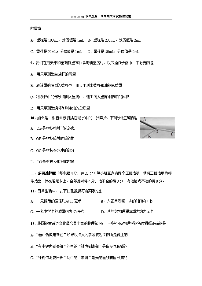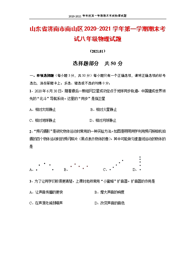 山东省济南市南山区2020-2021学年第一学期期末考试八年级物理试题(附答案)