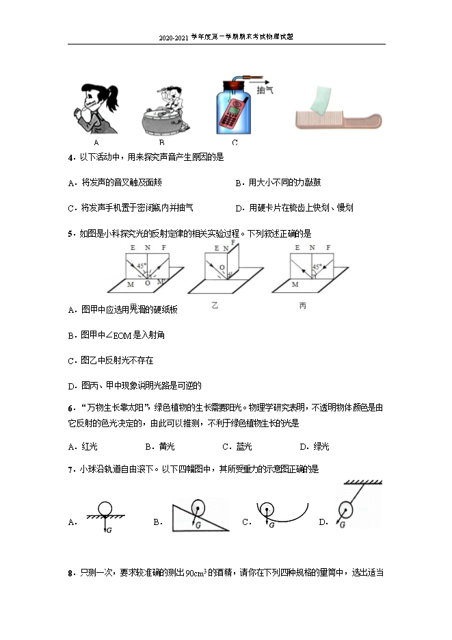 【内容简介】选择题部分 共50分一、单项选择题(每小题3分,共30分)每小题只有一个正确选项,请将正确选项的标号选出,涂在答题卡上。多选、错选或不选的均得0分。1.2020年6月30日,随着最后一颗组网卫星成功定点于地球同步轨道,中国建成世界领先的“北斗”导航系统。这里的“同步”是指卫星A.相对太阳静止 B.相对火星静止C.相对地球静止 D.相对月球静止2.“频闪摄影”是研究物体运动时常用的一种实验方法。如图是明明同学利用频闪照相机拍摄的四个物体运动时的频闪照片(黑点表示物体的像),其中可能做匀速直线运动的物体的是A. B. C. D. 3.为了让同学们听得更清楚,上课时老师常用“小蜜蜂”扩音器。扩音器的作用是A.让声音传播的更快B.增大声音的响度C.在声源处减弱噪声D.改变声音的音色4.以下活动中,用来探究声音产生原因的是A.将发声的音叉触及面颊 B.用大小不同的力敲鼓C.将发声手机置于密闭瓶内并抽气 D.用硬卡片在梳齿上快划、慢划5.如图是小科探究光的反射定律的相关实验过程。下列叙述正确的是A.图甲中应选用光滑的硬纸板 B.图甲中∠EOM是入射角C.图乙中反射光不存在 D.图丙、甲中现象说明光路是可逆的6.“万物生长靠太阳”,绿色植物的生长需要阳光。物理学研究表明,不透明物体颜色是由它反射的色光决定的,由此可以推测,不利于绿色植物生长的光是 A.红光 B.黄光 C.蓝光 D.绿光7.小球沿轨道自由滚下。以下四幅图中,其所受重力的示意图正确的是 A. B. C. D.8.只测一次,要求较准确的测出90cm3的酒精,请你在下列四种规格的量筒中,选出适当的量筒A.量程是100mL,分度值是1mLB.量程是200mL,分度值是2mLC.量程是50mL,分度值是1mLD.量程是50mL,分度值是2mL9.我们在用天平和量筒测量某种食用油密度时,以下操作步骤中,不必要的是A.用天平测出空烧杯的质量B.取适量的油倒入烧杯中,用天平测出烧杯和油的总质量C.将烧杯中的部分油倒入量筒中,测出倒入量筒中的油的体积D.用天平测出烧杯和剩余油的总质量10.如图是一根直树枝斜插在湖水中的一张照片,下列分析正确的是A.OB是树枝折射形成的像 B.OB是树枝反射形成的像C.OC是树枝在水中的部分 D.OC是树枝反射形成的像二、多项选择题(每小题4分,共20分)每小题至少有两个正确选项,请将正确选项的标号选出,涂在答题卡上。全部选对得4分,选不全的得3分,有选错或不选的得0分。11.日常生活中,以下估测数据符合实际的是A.一元硬币的直径约为25毫米 B.人正常呼吸一次的时间约1秒C.一名中学生的质量约为50千克 D.八年级物理课本重力约为4牛
