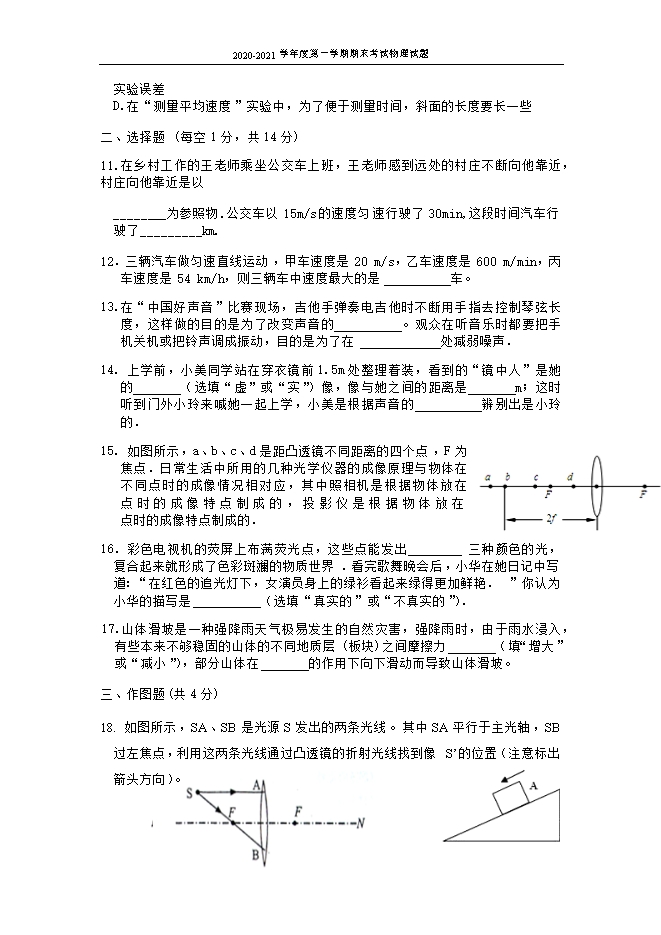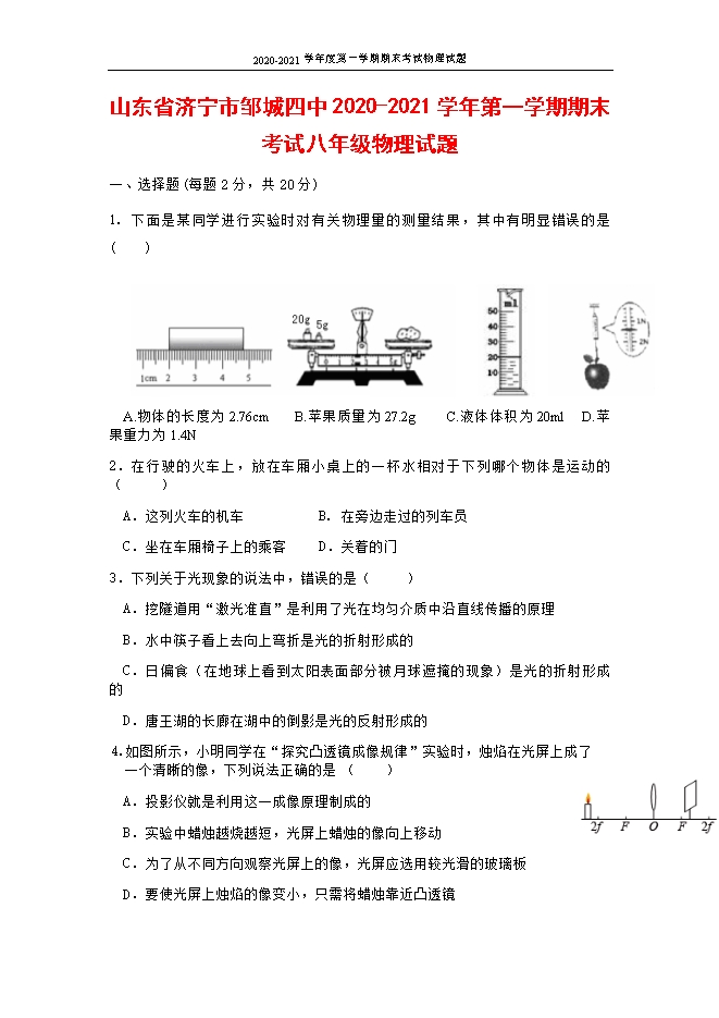 山东省济宁市邹城四中2020-2021学年第一学期期末考试八年级物理试题(无答案)
