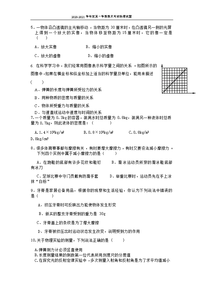 【内容简介】一、选择题(每题2分,共20分)1. 下面是某同学进行实验时对有关物理量的测量结果,其中有明显错误的是( ) A.物体的长度为2.76cm B.苹果质量为27.2g C.液体体积为20ml D.苹果重力为1.4N2.在行驶的火车上,放在车厢小桌上的一杯水相对于下列哪个物体是运动的( ) A.这列火车的机车 B. 在旁边走过的列车员 C.坐在车厢椅子上的乘客 D.关着的门3.下列关于光现象的说法中,错误的是( ) A.挖隧道用“激光准直”是利用了光在均匀介质中沿直线传播的原理 B.水中筷子看上去向上弯折是光的折射形成的 C.日偏食(在地球上看到太阳表面部分被月球遮掩的现象)是光的折射形成的 D.唐王湖的长廊在湖中的倒影是光的反射形成的4.如图所示,小明同学在“探究凸透镜成像规律”实验时,烛焰在光屏上成了一个清晰的像,下列说法正确的是( )A.投影仪就是利用这一成像原理制成的B.实验中蜡烛越烧越短,光屏上蜡烛的像向上移动C.为了从不同方向观察光屏上的像,光屏应选用较光滑的玻璃板D.要使光屏上烛焰的像变小,只需将蜡烛靠近凸透镜5.一物体沿凸透镜的主光轴移动,当物距为30厘米时,在凸透镜另一侧的光屏上得到一个放大的实像,当物体移至物距为15厘米时,它的像一定是( )A.放大实像 B.缩小的实像 C.放大的虚像 D.缩小的虚像6. 在科学学习中,我们经常用图像表示科学量之间的关系。如图所示的图像中,如果在横坐标和纵坐标加上适当的科学量及单位,能用来描述( )A.弹簧的长度与弹簧所受拉力的关系B.同种物质的密度与质量的关系C.物体所受重力与质量的关系D.匀速直线运动中速度与时间的关系7.一个质量为0.3kg的容器,装满水时总质量为0.8kg,装满另一种液体时总质量为0.7kg,则此液体的密度是:( ) A.1.4×103kg/m3 B.0.8×103kg/m3 C.0.8kg/m3 D.8kg/cm38.很多体育赛事都与摩擦有关,有时要增大摩擦力,有时又要设法减小摩擦力。下列四个实例中属于减小摩擦力的是( )A.在跑鞋的底部有许多花纹和鞋钉 B.滑 冰运动员所穿的滑冰鞋底部有冰刀C.足球比赛中守门员戴有防滑手套 D.举重比赛时,运动员先在手上涂抹“白粉”