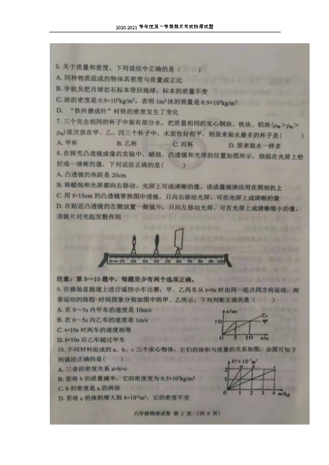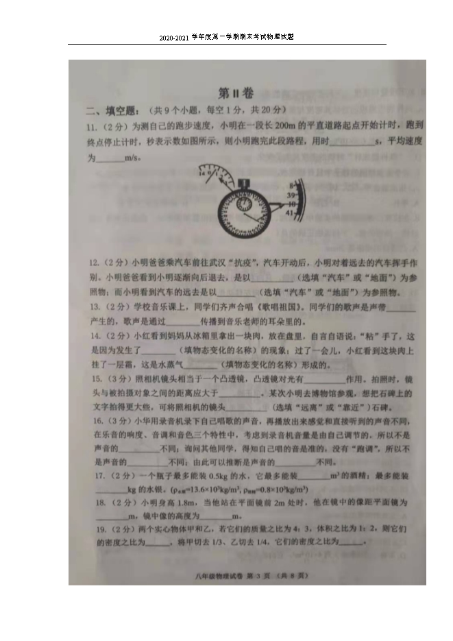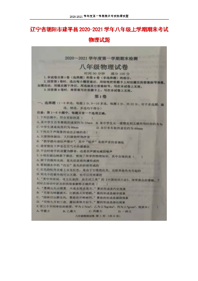 辽宁省朝阳市建平县2020-2021学年八年级上学期期末考试物理试题(图片版附答案)