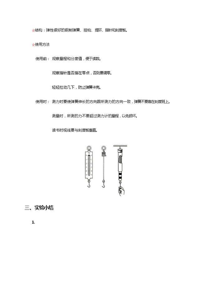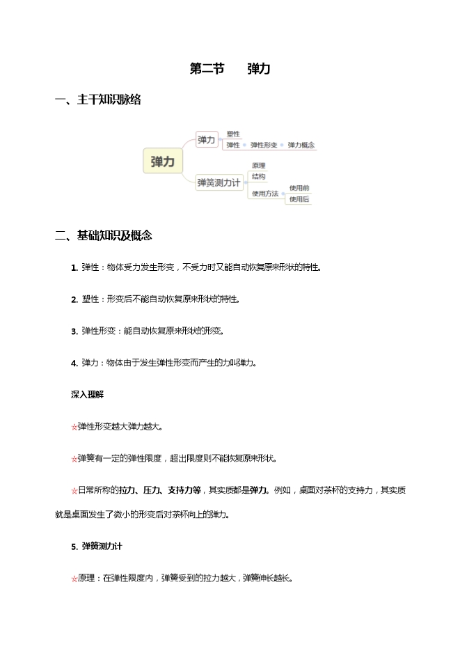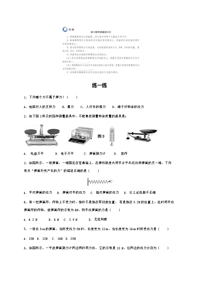 【内容简介】第二节 弹力一、主干知识脉络 二、基础知识及概念1. 弹性:物体受力发生形变,不受力时又能自动恢复原来形状的特性。2. 塑性:形变后不能自动恢复原来形状的特性。3. 弹性形变:能自动恢复原来形状的形变。4. 弹力:物体由于发生弹性形变而产生的力叫弹力。深入理解☆弹性形变越大弹力越大。☆弹簧有一定的弹性限度,超出限度则不能恢复原来形状。☆日常所称的拉力、压力、支持力等,其实质都是弹力。例如,桌面对茶杯的支持力,其实质就是桌面发生了微小的形变后对茶杯向上的弹力。5. 弹簧测力计☆原理:在弹性限度内,弹簧受到的拉力越大,弹簧伸长越长。☆结构:弹性很好的钢制弹簧、挂钩、提环、指针和刻度板。☆使用方法 使用前:○1观察量程和分度值,便于读数。 ○2观察指针是否指在零点,否则要调零。 ○3轻轻拉动几下,防止弹簧卡壳。 使用时:○1测力时要使弹簧伸长的方向跟所测力的方向一致,弹簧不要靠在刻度班上。 ○2测量时,所测的力不要超过测力计的量程,以免损坏。 ○3读书时视线要与刻度板垂直。 三、实验小结1. 练一练1、下列哪个力不属于弹力?( ) A、地面对人的支持力 B、重力 C、人对车的推力 D、绳子对物体的拉力2、如下图3所示的四种测量器具中,不能直接测量物体质量的器具是: A. 托盘天平 B.电子天平 C.弹簧测力计 D. 案秤3、如图所示,一根弹簧,一端固定在竖直墙上,在弹性限度内用手水平向右拉伸弹簧的另一端,下列有关“弹簧形变产生的力”的描述正确的是( ) A.手对弹簧的拉力 B.弹簧对手的拉力 C.墙对弹簧的拉力 D.以上说法都不正确4、有一把弹簧秤,秤钩上不受力时,指针不是指在零刻度位置,而是指在0.2N的位置上,此时用手拉弹簧秤的秤钩,使弹簧秤的示数为4N,则手拉弹簧的力是( )A.4.2 N B.4 N C.3.8 N D.无法判断5、一根长8cm的弹簧,当所受拉力8N时,长度变为12cm,当长度变为14cm时所受拉力是( )A.10N B.12N C.14N D.20N6、如图所示,一平放弹簧测力计两边同时用力拉,它的示数是10 N,这两边的拉力分别为( )A.5 N,5 N B.10 N,10 N C.0 N,0 N D.20 N,20 N 7、如图所示,一根弹簧,一端固定在竖直墙上,在弹性限度内用手水平向右拉伸弹簧另一端,下列有关“弹簧形变产生的力”描述正确的是( )A. 手对弹簧的拉力 B. 弹簧对手的拉力C. 墙对弹簧的拉力 D. 以上说法都正确