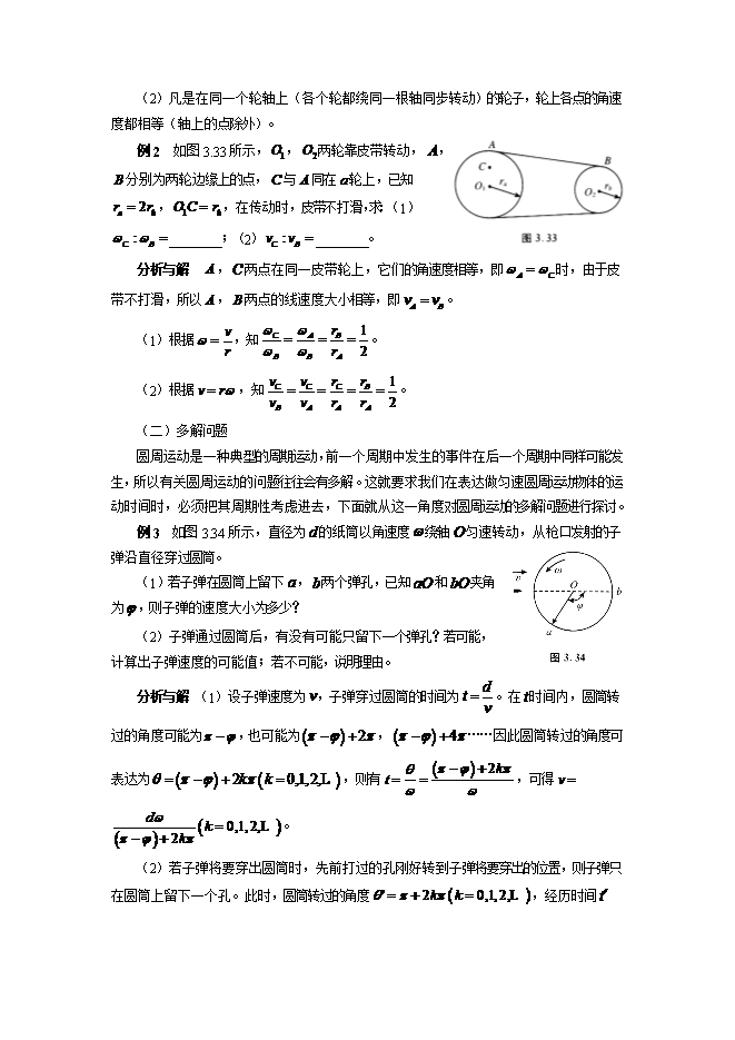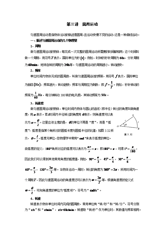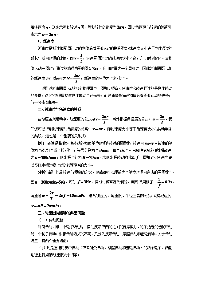 【内容简介】匀速圆周运动是指物体运动的轨迹是圆周,且运动快慢不变的运动,这是一种曲线运动。一、描述匀速圆周运动的几个物理量1.周期做匀速圆周运动的物体,每完成一次完整的圆周运动所需要的时间都相同,这个时间叫做一个周期,用符号 表示,国际单位为秒 。例如,时钟的秒针周期为 ,分针周期为 ,地球自转的周期为 等。匀速圆周运动的周期越小,转动越快。2.频率单位时间内物体完成的圆周数,叫做匀速圆周运动的频率,用符号 表示,国际单位为赫兹 ,频率越大,转动越快,频率与周期互为倒数,即 。例如,秒针转动的频率为 ,每分钟转动300转的电风扇,其转动频率为 。3.角速度做匀速圆周运动的物体,单位时间内物体与圆心的连线(即半径)转过的角度叫做角速度,用 表示。若 时间内半径转过的角度用 表示,则角速度可以表示为 。这里应该注意的是, 的单位不再是“度”,而是“弧度”,弧度是指某个角所对的圆弧长度与圆弧半径的比值,如图3.32所示, ,弧度无单位,但物理学中常用“ ”来表示弧度的单位。由弧度的定义, 角所对应的弧度可以表示为 ,即 ,可得 ,因此我们可以得到其他常用角度的弧度值,例如, , , , , 等。当物体运动一周时,转过的角度为 ,所用时间为一个周期 ,因此匀速圆周运动的角速度还可以表示为 等,根据角速度的定义式 ,可知角速度的单位为“弧度/秒”,符号为“ ”。4.转速转速表示物体单位时间内完成的圆周数,常用单位有“转/秒”和“转/分”,符号分别为“ ”和“ ”, 。转速取“转/秒”作为单位时,其数值与频率相同。若转速为 ,则表示每秒转过 周,每秒转过的角度为 ,因此角速度与转速的关系可表示为 。5.线速度线速度是描述做圆周运动的物体沿着圆弧运动的快慢程度,线速度大小等于物体通过的弧长与所用时间的比值,即 ,匀速圆周运动的线速度大小不变,方向时刻变化。当物体运动一周时,通过的路程为圆的周长 ,所用时间为一个周期 ,因此匀速圆周运动的线速度还可以表示为 ,线速度的单位为“米/秒”。上述描述匀速圆周运动的5个物理量中,周期、频率、角速度和转速描述的是物体转动的快慢,这4个物理量均与物体转动半径无关,而线速度是描述物体沿着圆弧运动的快慢,与半径密切相关。二、线速度与角速度的关系在匀速圆周运动中,线速度的公式为 ,另外根据角速度的公式。 ,我们还可以得到线速度与角速度的关系: ,即线速度大小等于角速度大小与转动半径的乘积,这也是一个重要的关系式。例1 转速是指做匀速转动的物体单位时间内转过的圆周数,转速用 表示。转速的单位为“转/分”或“转/秒”,符号分别为“ ”和“ ”。已知洗衣机的脱水桶转速为 ,脱水桶半径为 ,求脱水桶转动的频率 、周期 、角速度 以及脱水桶边缘上点的线速度 的大小。分析与解 比较转速与频率的定义,两者都可以理解为“单位时间内完成的圆周数”,因 ,可知 ,周期与频率互为倒数,则可得周期 ,角速度 ,结合线速度、角速度、半径三者的关系,可得线速度 。三、匀速圆周运动的典型问题(一)传动问题所谓传动,即一个轮子转动时,借助皮带或两轮之间的静摩擦力、轮子边缘的齿轮带动另一个轮子转动。根据传动方式的不同,又分为皮带传动、摩擦传动和齿轮传动。关于传动装置,有两个重要结论:(1)凡是直接用皮带传动(或者链条传动、摩擦传动和齿轮传动)的两个轮子,两轮边缘上各点的线速度大小相等。