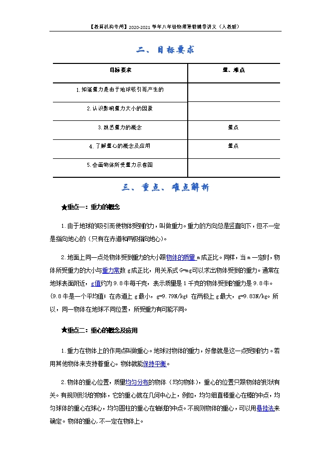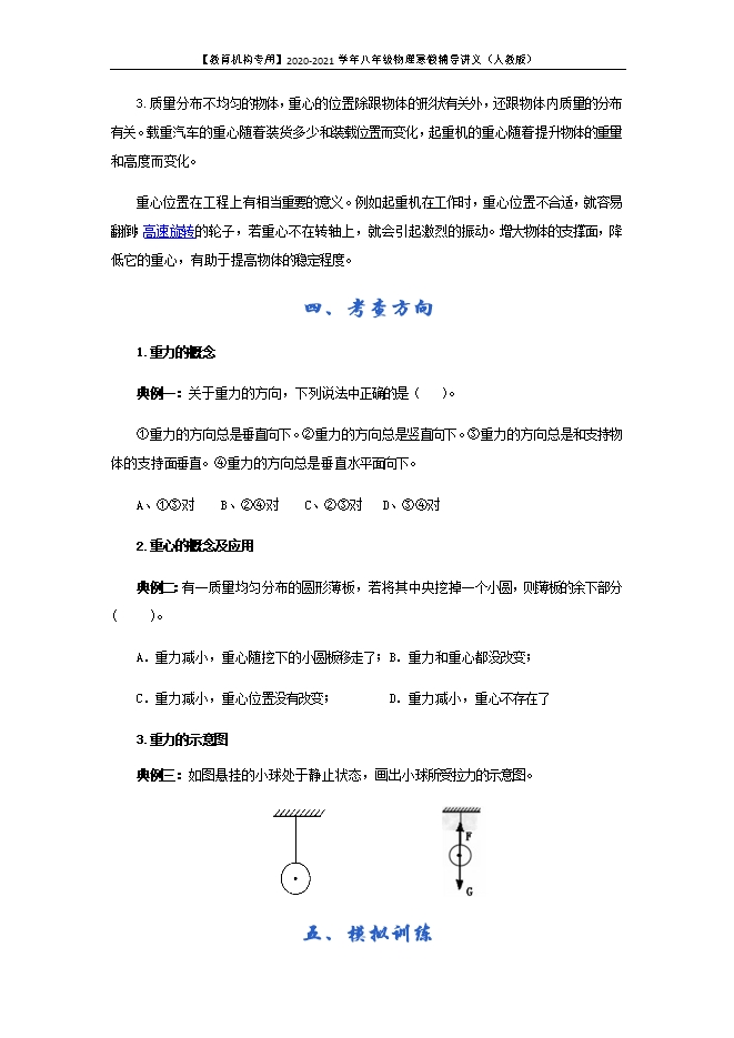 【内容简介】一、知识点解析1.万有引力:宇宙间任何两个物体都存在互相吸引的力,这就是万有引力。2.重力:地面附近的物体,由于地球的吸引而受的力叫重力。重力的符号是G。(1)重力区别于其他力的基本特征:1)地面附近的一切物体,无论固体、液体、气体都受地球的吸引;2)重力特指地球对物体的吸引;3)重力的施力者是地球,受力者是物体。(2)重力的大小:通常把重力的大小叫重量。1)重量的计算公式:G=mg,其中g=9.8N/kg,粗略计算的时候g=10N/kg。G的含义:质量为1kg的物体所受的重力为9.8N。2)重力的方向:竖直向下。3)重力的作用点—重心:重力在物体上的作用点叫重心。质地均匀外形规则的物体的重心,在它的几何中心上。如球的重心在球心。方形薄木板的重心在两条对角线的交点。重心的位置不一定总在物体上,如圆环的重心在圆心,空心球的重心在球心。3.稳度:稳度就是物体的稳定程度,稳度越大,物体就越不容易倾倒。提高稳度的方法:一是增大支持面,二是降低重心。4.重力的大小与物体的质量、地理位置有关;即质量越大,物体受到的重力越大。在地球上,越靠近赤道,物体受到的重力越小,越靠近两极,物体受到的重力越大。 二、目标要求目标要求重、难点1.知道重力是由于地球吸引而产生的2.认识影响重力大小的因素3.熟悉重力的概念重点4.了解重心的概念及应用重点5.会画物体所受重力示意图三、重点、难点解析★重点一:重力的概念1.由于地球的吸引而使物体受到的力,叫做重力。重力的方向总是竖直向下,但不一定是指向地心的(只有在赤道和两极指向地心)。2.地面上同一点处物体受到重力的大小跟物体的质量m成正比。同样,当m一定时,物体所受重力的大小与重力常数g成正比,用关系式G=mg可以求出物体受到的重力。通常在地球表面附近,g值约为9.8牛每千克,表示质量是1千克的物体受到的重力是9.8牛。(9.8牛是一个平均值;在赤道上g最小,g=9.79N/kg;在两极上g最大,g=9.83N/kg。所以,同一物体在地球不同位置,所受重力有可能不同。★重点二:重心的概念及应用1.重力在物体上的作用点叫做重心。地球对物体的重力,好像就是这一点受到的力。若用其他物体来支持着重心,物体就能保持平衡。2.物体的重心位置,质量均匀分布的物体(均匀物体),重心的位置只跟物体的形状有关。有规则形状的物体,它的重心就在几何中心上,例如,均匀细直棒重心在棒的中点,均匀球体的重心在球心,均匀圆柱的重心在轴线的中点。不规则物体的重心,可以用悬挂法来确定。物体的重心,不一定在物体上。3.质量分布不均匀的物体,重心的位置除跟物体的形状有关外,还跟物体内质量的分布有关。载重汽车的重心随着装货多少和装载位置而变化,起重机的重心随着提升物体的重量和高度而变化。重心位置在工程上有相当重要的意义。例如起重机在工作时,重心位置不合适,就容易翻倒;高速旋转的轮子,若重心不在转轴上,就会引起激烈的振动。增大物体的支撑面,降低它的重心,有助于提高物体的稳定程度。四、考查方向1.重力的概念典例一:关于重力的方向,下列说法中正确的是( )。①重力的方向总是垂直向下。②重力的方向总是竖直向下。③重力的方向总是和支持物体的支持面垂直。④重力的方向总是垂直水平面向下。A、①③对 B、②④对 C、②③对 D、③④对 【解析】重力是由于地球的吸引而产生的,重力的方向竖直向下或者说垂直于当地的水平面,并非指向球心。①重力的方向始终是竖直向下,而不是垂直向下,故①错误,故②正确;③重力的方向始终是竖直向下,即总是垂直水平面向下,与支持物体的支持面不一定垂直,故③错误,④正确。故选B。2.重心的概念及应用典例二:有一质量均匀分布的圆形薄板,若将其中央挖掉一个小圆,则薄板的余下部分( )。A.重力减小,重心随挖下的小圆板移走了;B.重力和重心都没改变;C.重力减小,重心位置没有改变; D.重力减小,重心不存在了【答案】C。【解析】质量均匀分布的圆形薄板,重心在其几何中心。其中央挖掉一个小圆,质量仍然均匀分布,关于圆心对称,即形状规则,故其重心仍然在圆心。