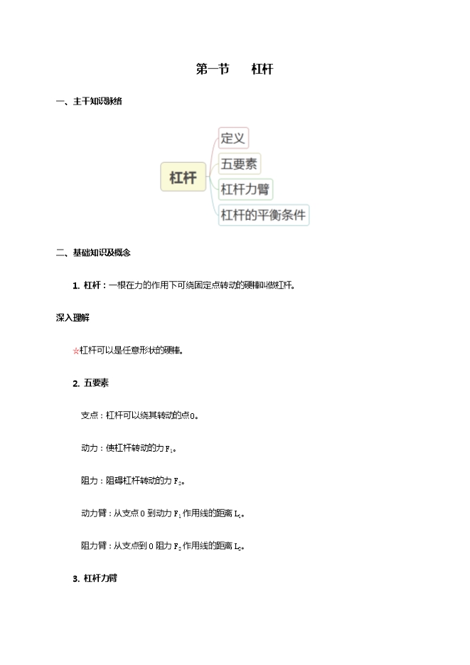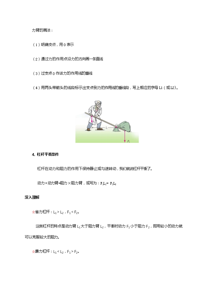 【内容简介】二、基础知识及概念1. 杠杆:一根在力的作用下可绕固定点转动的硬棒叫做杠杆。深入理解☆杠杆可以是任意形状的硬棒。2. 五要素 支点:杠杆可以绕其转动的点O。 动力:使杠杆转动的力F1。 阻力:阻碍杠杆转动的力F2。 动力臂:从支点O到动力F1作用线的距离L1。 阻力臂:从支点到O阻力F2作用线的距离L2。3. 杠杆力臂力臂的画法:(1)明确支点,用O表示 (2)通过力的作用点沿力的方向画一条直线(3)过支点O作该力的作用线的垂线(4)用两头带箭头的线段标示出支点到力的作用线的垂线段,写上相应的字母L1(或L2)。 4. 杠杆平衡条件 杠杆在动力和阻力的作用下保持静止或匀速转动,我们就说杠杆平衡了。 动力×动力臂=阻力×阻力臂,或写为:F1L1= F2L2深入理解☆省力杠杆:L1>L2,F1<F2。 这类杠杆的特点是动力臂L1大于阻力臂L2,平衡时动力F1小于阻力F2,即用较小的动力就可以克服较大的阻力。☆费力杠杆:L1<L2,F1>F2。 特点是动力臂L1小于阻力臂L2,平衡时动力F1大于阻力F2,即要用较大的动力才能克服阻力完成工作,但它的优点是杠杆工作时,动力移动较小的距离就能使阻力移动较大的距离。使工作方便,也就是省了距离。☆等臂杠杆:L1=L2,F1=F2。 这类杠杆的动力臂L1等于阻力臂L2,平衡时动力F1等于阻力F2,工作时既不省力也不费力。☆没有既省力、又省距离的杠杆。