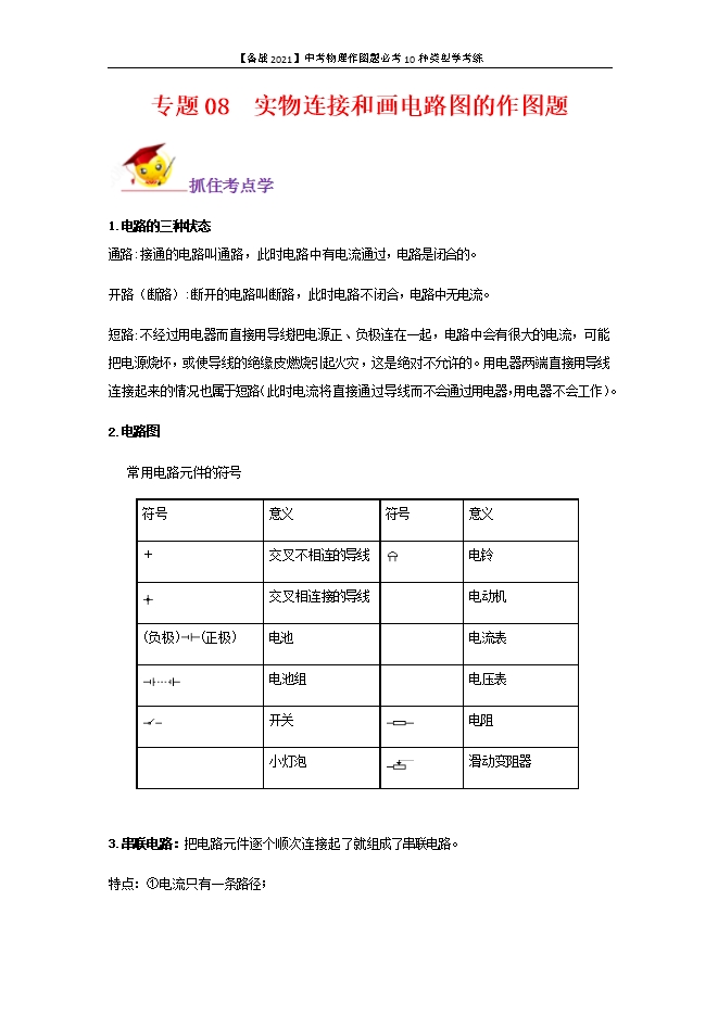 【备战2021】中考物理作图题必考10种类型学考练:专题08 实物连接和画电路图的作图题(原卷版和解析版)