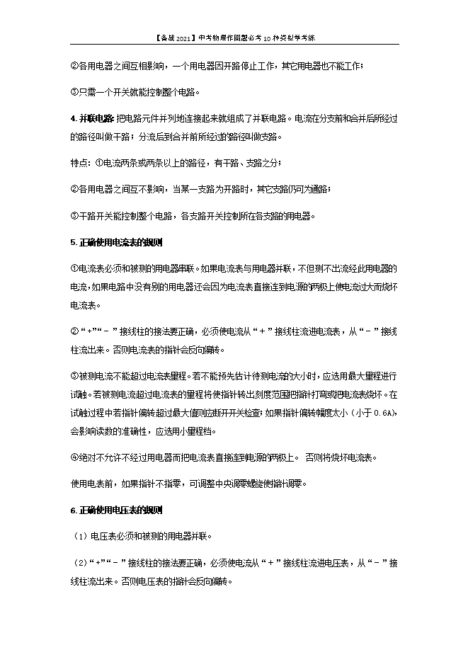 【内容简介】1.电路的三种状态通路:接通的电路叫通路,此时电路中有电流通过,电路是闭合的。开路(断路):断开的电路叫断路,此时电路不闭合,电路中无电流。短路:不经过用电器而直接用导线把电源正、负极连在一起,电路中会有很大的电流,可能把电源烧坏,或使导线的绝缘皮燃烧引起火灾,这是绝对不允许的。用电器两端直接用导线连接起来的情况也属于短路(此时电流将直接通过导线而不会通过用电器,用电器不会工作)。2.电路图常用电路元件的符号符号意义符号意义+交叉不相连的导线 电铃 交叉相连接的导线○M电动机(负极) (正极)电池○A电流表 电池组○V电压表 开关 电阻○×小灯泡 滑动变阻器3.串联电路:把电路元件逐个顺次连接起了就组成了串联电路。特点:①电流只有一条路径;②各用电器之间互相影响,一个用电器因开路停止工作,其它用电器也不能工作;③只需一个开关就能控制整个电路。4.并联电路:把电路元件并列地连接起来就组成了并联电路。电流在分支前和合并后所经过的路径叫做干路;分流后到合并前所经过的路径叫做支路。特点:①电流两条或两条以上的路径,有干路、支路之分;②各用电器之间互不影响,当某一支路为开路时,其它支路仍可为通路;③干路开关能控制整个电路,各支路开关控制所在各支路的用电器。5.正确使用电流表的规则①电流表必须和被测的用电器串联。如果电流表与用电器并联,不但测不出流经此用电器的电流,如果电路中没有别的用电器还会因为电流表直接连到电源的两极上使电流过大而烧坏电流表。②“+”“-”接线柱的接法要正确,必须使电流从“+”接线柱流进电流表,从“-”接线柱流出来。否则电流表的指针会反向偏转。③被测电流不能超过电流表量程。若不能预先估计待测电流的大小时,应选用最大量程进行试触。若被测电流超过电流表的量程将使指针转出刻度范围把指针打弯或把电流表烧坏。在试触过程中若指针偏转超过最大值则应断开开关检查;如果指针偏转幅度太小(小于0.6A),会影响读数的准确性,应选用小量程档。④绝对不允许不经过用电器而把电流表直接连到电源的两极上。 否则将烧坏电流表。使用电表前,如果指针不指零,可调整中央调零螺旋使指针调零。6.正确使用电压表的规则(1)电压表必须和被测的用电器并联。(2)“+”“-”接线柱的接法要正确,必须使电流从“+”接线柱流进电压表,从“-”接线柱流出来。否则电压表的指针会反向偏转。(3)被测电压不能超过电压表量程。若不能预先估计待测电压的大小时,应选用最大量程进行试触。(4)电压表的两个接线柱可以直接连到电源的两极上,此时测得的是电源的电压值。使用电表前,如果指针不指零,可调整中央调零螺旋使指针调零。7.电学作图精准技巧(1)串联简单,并联抓住 “分支点”;(2)注意“分支点”、“+、-”接线柱、量程以及滑动变阻器的连线(“一上一下”和“阻值变化”);(3)首先判断用电器串并联,在根据要求把开关装到合适位置.