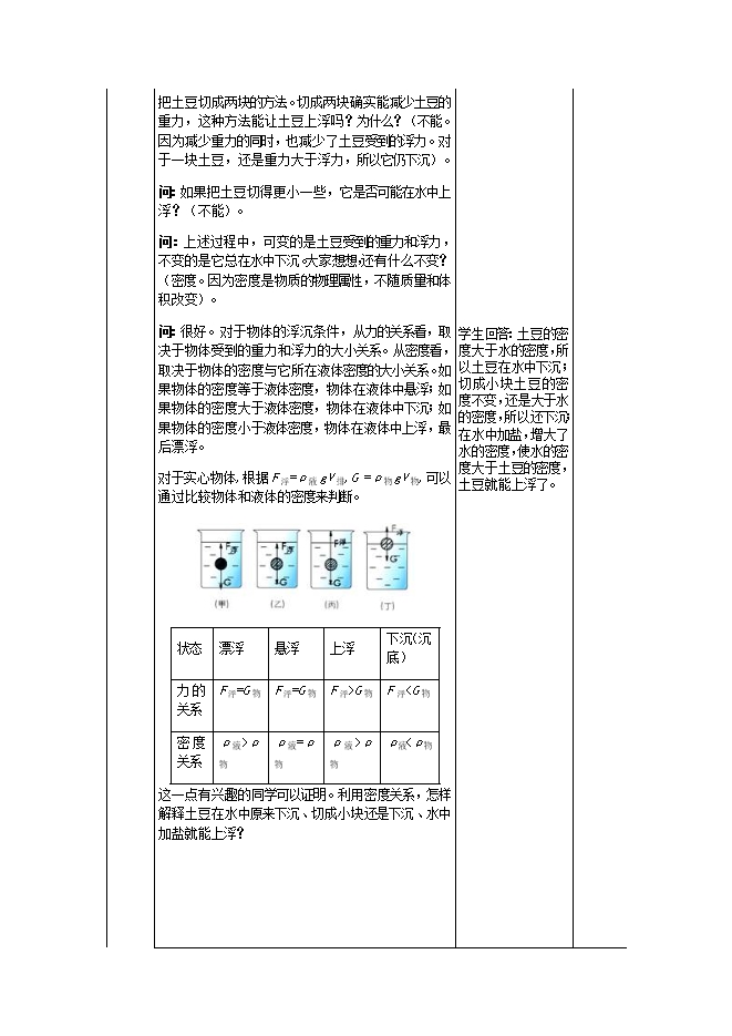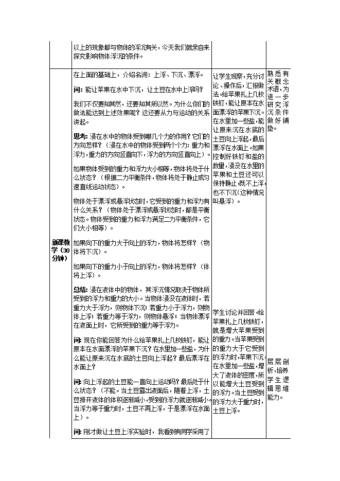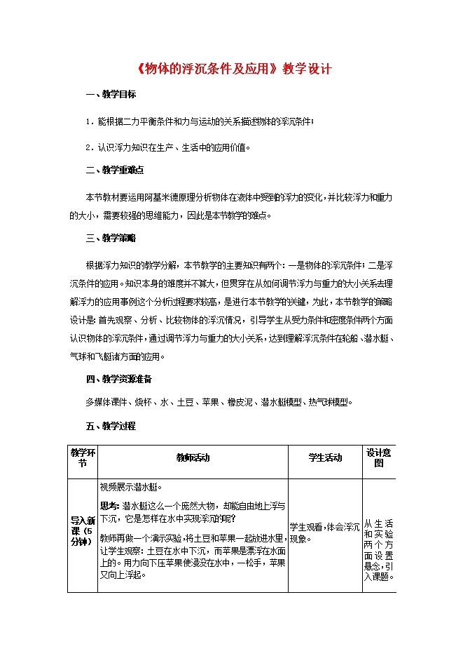 【内容简介】一、教学目标1.能根据二力平衡条件和力与运动的关系描述物体的浮沉条件;2.认识浮力知识在生产、生活中的应用价值。二、教学重难点本节教材要运用阿基米德原理分析物体在液体中受到的浮力的变化,并比较浮力和重力的大小,需要较强的思维能力,因此是本节教学的难点。三、教学策略根据浮力知识的教学分解,本节教学的主要知识有两个:一是物体的浮沉条件;二是浮沉条件的应用。知识本身的难度并不算大,但贯穿在从如何调节浮力与重力的大小关系去理解浮力的应用事例这个分析过程要求较高,是进行本节教学的关键,为此,本节教学的策略设计是:首先观察、分析、比较物体的浮沉情况,引导学生从受力条件和密度条件两个方面认识物体的浮沉条件,通过调节浮力与重力的大小关系,达到理解浮沉条件在轮船、潜水艇、气球和飞艇诸方面的应用。四、教学资源准备多媒体课件、烧杯、水、土豆、苹果、橡皮泥、潜水艇模型、热气球模型。五、教学过程教学环节教师活动学生活动设计意图导入新课(5分钟)视频展示潜水艇。思考:潜水艇这么一个庞然大物,却能自由地上浮与下沉,它是怎样在水中实现浮沉的呢?教师再做一个演示实验,将土豆和苹果一起放进水里,让学生观察:土豆在水中下沉,而苹果是漂浮在水面上的。用力向下压苹果使浸没在水中,一松手,苹果又向上浮起。以上的现象都与物体的浮沉有关,今天我们就亲自来探究影响物体浮沉的条件。 学生观看,体会浮沉现象。 从生活和实验两个方面设置悬念,引入课题。新课教学(30分钟)在上面的基础上,介绍名词:上浮、下沉、漂浮。问:能让苹果在水中下沉,让土豆在水中上浮吗?我们不仅要知其然,还要知其所以然。为什么你们的做法能达到上述效果呢?这还要从力与运动的关系讲起。思考:浸在水中的物体受到哪几个力的作用?它们的方向怎样?(浸在水中的物体受到两个个力:重力和浮力,重力的方向竖直向下,浮力的方向竖直向上)。如果物体受到的重力和浮力大小相等,物体将处于什么状态?(根据二力平衡条件,物体将处于静止或匀速直线运动状态)。物体处于漂浮或悬浮状态时,它受到的重力和浮力有什么关系?(物体处于漂浮或悬浮状态时,都是平衡状态。物体受到的重力和浮力满足二力平衡条件,它们大小相等)。如果向下的重力大于向上的浮力,物体将怎样?(物体将下沉)。如果向下的重力小于向上的浮力,物体将怎样?(体将上浮)。总结:浸在液体中的物体,其浮沉情况取决于物体所受到的浮力和重力的大小。当物体浸没在液体时,若重力大于浮力,则物体下沉;若重力小于浮力,则物体上浮;若重力等于浮力,则物体悬浮;当物体漂浮在液面上时,它所受到的重力等于浮力。问:现在你能回答为什么给苹果扎上几枚铁钉,能让原本在水面漂浮的苹果下沉?在水里加一些盐,为什么能让原来沉在水底的土豆向上浮起?最后漂浮在水面上?问:向上浮起的土豆能一直向上运动吗?最后处于什么状态?(不能。当土豆露出液面后,随着上浮,土豆排开液体的体积逐渐减小,受到的浮力就逐渐减小。当浮力等于重力时,土豆不再上浮,于是漂浮在水面上)。问:刚才做让土豆上浮实验时,我看到有同学采用了把土豆切成两块的方法。切成两块确实能减少土豆的重力,这种方法能让土豆上浮吗?为什么?(不能。因为减少重力的同时,也减少了土豆受到的浮力。对于一块土豆,还是重力大于浮力,所以它仍下沉)。