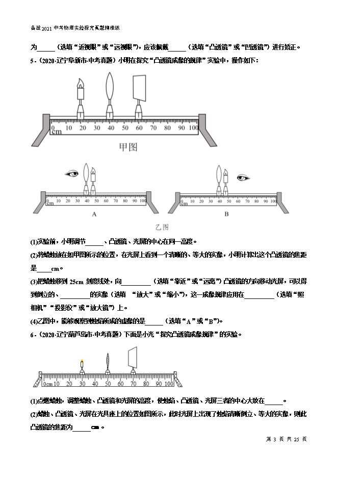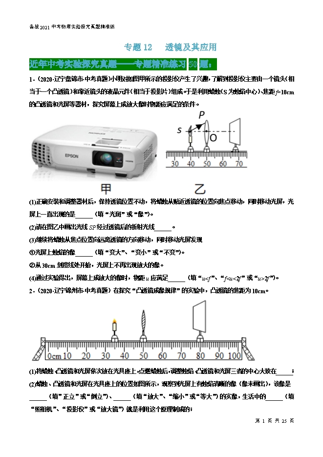 【内容简介】近年中考实验探究真题——专题精准练习50题:1.(2020•辽宁盘锦市•中考真题)小明对如图甲所示的投影仪产生了兴趣,了解到投影仪主要由一个镜头(相当于一个凸透镜)和靠近镜头的液晶元件(相当于投影片)组成。于是利用蜡烛(S为烛焰中心)、焦距f=10cm的凸透镜和光屏等器材,探究屏幕上成放大像时物距应满足的条件。 (1)正确安装和调整器材后,保持透镜位置不动,将蜡烛从贴近透镜的位置向焦点移动,同时移动光屏,光屏上一直出现的是______(填“光斑”或“像”)。(2)请在图乙中画出光线SP经过透镜后的折射光线______。(3)继续将蜡烛从焦点位置向远离透镜的方向移动,同时移动光屏发现①光屏上烛焰的像______(填“变大”、“变小”或“不变”)。②从30cm刻度线处开始,光屏上不再出现放大的像。(4)通过实验得出,屏幕上成放大的像时,物距u应满足______(填“u2f”)。2.(2020•辽宁锦州市•中考真题)在探究“凸透镜成像规律”的实验中,凸透镜的焦距为10cm。 (1)将蜡烛、凸透镜和光屏依次放在光具座上,点燃蜡烛后,调整烛焰、凸透镜和光屏三者的中心大致在______;(2)蜡烛、凸透镜和光屏在光具座上的位置如图所示,观察到光屏上有烛焰清晰的像(像未画出),该像是______(填”正立”或“倒立”)、______(填“放大”、“缩小”或“等大”)的实像,生活中的______(填“照相机”、“投影仪”或“放大镜”)就是利用这个原理制成的;(3)实验过程中由于蜡烛燃烧变短,烛焰在光屏上的像将向______移动,为了使烛焰的像再次成在光屏中央,应将凸透镜向______移动。(两空均填“上”或“下”)3.(2020•辽宁鞍山市•中考真题)在探究“凸透镜成像规律”的实验中,将凸透镜固定在光具座上50cm刻度线处不动,移动蜡烛和光屏至如图所示的位置时,在光屏上得到烛焰清晰的像。 (1)该凸透镜的焦距为______cm。(2)将蜡烛移到10cm刻度线处,烛焰所成的像是______(填“放大”、“缩小”或“等大”)的,生活中的______(填“照相机”、“投影仪”或“放大镜”)利用了该原理工作。(3)在烛焰和凸透镜之间放一眼镜的镜片,发现光屏上的像由清晰变模糊了。将光屏向靠近凸透镜的方向移动适当距离后,光屏上再次呈现清晰的像,则该眼镜的镜片是______(填“凸透镜”或“凹透镜”),可用于矫正______(填“近视眼”或“远视眼”)。(4)蜡烛随着燃烧而变短,为了使像仍能成在光屏中央,这时需要______(填“向上”或“向下”)移动光屏。4.(2020•山东烟台市•中考真题)在“探究凸透镜成像的规律”的实验中,小明利用如图所示的装置进行实验,他先调整烛焰中心、透镜中心及光屏中心位于同一高度上,然后将它们调节到图示位置时,光屏上得到清晰的像。 (1)此时像的特点是什么?______(说明像的倒正、大小和虚实)(2)若保持透镜位置不动,把蜡烛移到零刻度处,则应向______(选填“左”或“右”)移动光屏才能在光屏上再次得到清晰的像,且像的大小______(选填“变大”、“变小”或“不变”);(3)若将蜡烛移到20cm刻度处透镜保持不动,移动光屏后再次得到清晰的像,则此时蜡烛经凸透镜成______(选填“放大”、“缩小”或“等大”)的像;(4)人的眼睛是通过改变晶状体的厚度来看清远近不同物体的,现将图中虚线圆圈部分行做是人的“眼睛”,当蜡烛远离“眼睛”时,“眼睛”需调节凸透镜的厚度使其______(选填“变薄”或“变厚”),改变其对光线的偏折能力,从而在光屏上成清晰的像。若该“眼睛”无法调节凸透镜达到应有的厚度,则该“眼睛”为______(选填“近视眼”或“远视眼”),应该佩戴______(选填“凸透镜”或“凹透镜”)进行矫正。5.(2020•辽宁阜新市•中考真题)小明在探究“凸透镜成像的规律”实验中,操作如下: (1)实验前,小明调节______、凸透镜、光屏的中心在同一高度。(2)将蜡烛放在如甲图所示的位置,在光屏上看到一个清晰的、等大的实像,小明计算出这个凸透镜的焦距是_____cm。(3)把蜡烛移到 25cm 刻度线处,向__________(选填“靠近”或“远离”)凸透镜的方向移动光屏,可以得到倒立的、__________的实像(选填 “放大”或“缩小”),这一成像规律应用在__________(选填“照相机”“投影仪”或“放大镜”)上。(4)乙图中,能够观察到烛焰所成的虚像的是______(选填“A”或“B”)。近年中考实验探究真题——专题精准练习50题:1.(2020•辽宁盘锦市•中考真题)小明对如图甲所示的投影仪产生了兴趣,了解到投影仪主要由一个镜头(相当于一个