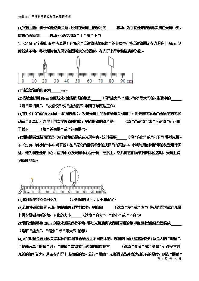 下载地址1|sj/2021/3/20213919843.rar<p>近年中考实验探究真题——专题精准练习50题:</p><p>1.(2020•辽宁盘锦市•中考真题)小明对如图甲所示的投影仪产生了兴趣,了解到投影仪主要由一个镜头(相当于一个凸透镜)和靠近镜头的液晶元件(相当于投影片)组成。于是利用蜡烛(S为烛焰中心)、焦距f=10cm的凸透镜和光屏等器材,探究屏幕上成放大像时物距应满足的条件。</p><p> </p><p>(1)正确安装和调整器材后,保持透镜位置不动,将蜡烛从贴近透镜的位置向焦点移动,同时移动光屏,光屏上一直出现的是______(填“光斑”或“像”)。</p><p>(2)请在图乙中画出光线SP经过透镜后的折射光线______。</p><p>(3)继续将蜡烛从焦点位置向远离透镜的方向移动,同时移动光屏发现</p><p>①光屏上烛焰的像______(填“变大”、“变小”或“不变”)。</p><p>②从30cm刻度线处开始,光屏上不再出现放大的像。</p><p>(4)通过实验得出,屏幕上成放大的像时,物距u应满足______(填“u<f”、“f<u<2f”或“u>2f”)。</p><p>2.(2020•辽宁锦州市•中考真题)在探究“凸透镜成像规律”的实验中,凸透镜的焦距为10cm。</p><p> </p><p>(1)将蜡烛、凸透镜和光屏依次放在光具座上,点燃蜡烛后,调整烛焰、凸透镜和光屏三者的中心大致在______;</p><p>(2)蜡烛、凸透镜和光屏在光具座上的位置如图所示,观察到光屏上有烛焰清晰的像(像未画出),该像是______(填”正立”或“倒立”)、______(填“放大”、“缩小”或“等大”)的实像,生活中的______(填“照相机”、“投影仪”或“放大镜”)就是利用这个原理制成的;</p><p>(3)实验过程中由于蜡烛燃烧变短,烛焰在光屏上的像将向______移动,为了使烛焰的像再次成在光屏中央,应将凸透镜向______移动。(两空均填“上”或“下”)</p><p>3.(2020•辽宁鞍山市•中考真题)在探究“凸透镜成像规律”的实验中,将凸透镜固定在光具座上50cm刻度线处不动,移动蜡烛和光屏至如图所示的位置时,在光屏上得到烛焰清晰的像。</p><p> </p><p>(1)该凸透镜的焦距为______cm。</p><p>(2)将蜡烛移到10cm刻度线处,烛焰所成的像是______(填“放大”、“缩小”或“等大”)的,生活中的______(填“照相机”、“投影仪”或“放大镜”)利用了该原理工作。</p><p>(3)在烛焰和凸透镜之间放一眼镜的镜片,发现光屏上的像由清晰变模糊了。将光屏向靠近凸透镜的方向移动适当距离后,光屏上再次呈现清晰的像,则该眼镜的镜片是______(填“凸透镜”或“凹透镜”),可用于矫正______(填“近视眼”或“远视眼”)。</p><p>(4)蜡烛随着燃烧而变短,为了使像仍能成在光屏中央,这时需要______(填“向上”或“向下”)移动光屏。</p><p>4.(2020•山东烟台市•中考真题)在“探究凸透镜成像的规律”的实验中,小明利用如图所示的装置进行实验,他先调整烛焰中心、透镜中心及光屏中心位于同一高度上,然后将它们调节到图示位置时,光屏上得到清晰的像。</p><p> </p><p>(1)此时像的特点是什么?______(说明像的倒正、大小和虚实)</p><p>(2)若保持透镜位置不动,把蜡烛移到零刻度处,则应向______(选填“左”或“右”)移动光屏才能在光屏上再次得到清晰的像,且像的大小______(选填“变大”、“变小”或“不变”);</p><p>(3)若将蜡烛移到20cm刻度处透镜保持不动,移动光屏后再次得到清晰的像,则此时蜡烛经凸透镜成______(选填“放大”、“缩小”或“等大”)的像;</p><p>(4)人的眼睛是通过改变晶状体的厚度来看清远近不同物体的,现将图中虚线圆圈部分行做是人的“眼睛”,当蜡烛远离“眼睛”时,“眼睛”需调节凸透镜的厚度使其______(选填“变薄”或“变厚”),改变其对光线的偏折能力,从而在光屏上成清晰的像。若该“眼睛”无法调节凸透镜达到应有的厚度,则该“眼睛”为______(选填“近视眼”或“远视眼”),应该佩戴______(选填“凸透镜”或“凹透镜”)进行矫正。</p><p>5.(2020•辽宁阜新市•中考真题)小明在探究“凸透镜成像的规律”实验中,操作如下:</p><p> </p><p> </p><p>(1)实验前,小明调节______、凸透镜、光屏的中心在同一高度。</p><p>(2)将蜡烛放在如甲图所示的位置,在光屏上看到一个清晰的、等大的实像,小明计算出这个凸透镜的焦距是_____cm。</p><p>(3)把蜡烛移到 25cm 刻度线处,向__________(选填“靠近”或“远离”)凸透镜的方向移动光屏,可以得到倒立的、__________的实像(选填 “放大”或“缩小”),这一成像规律应用在__________(选填“照相机”“投影仪”或“放大镜”)上。</p><p>(4)乙图中,能够观察到烛焰所成的虚像的是______(选填“A”或“B”)。</p><p><br /></p>不限不限试题试卷专供vip会员docx