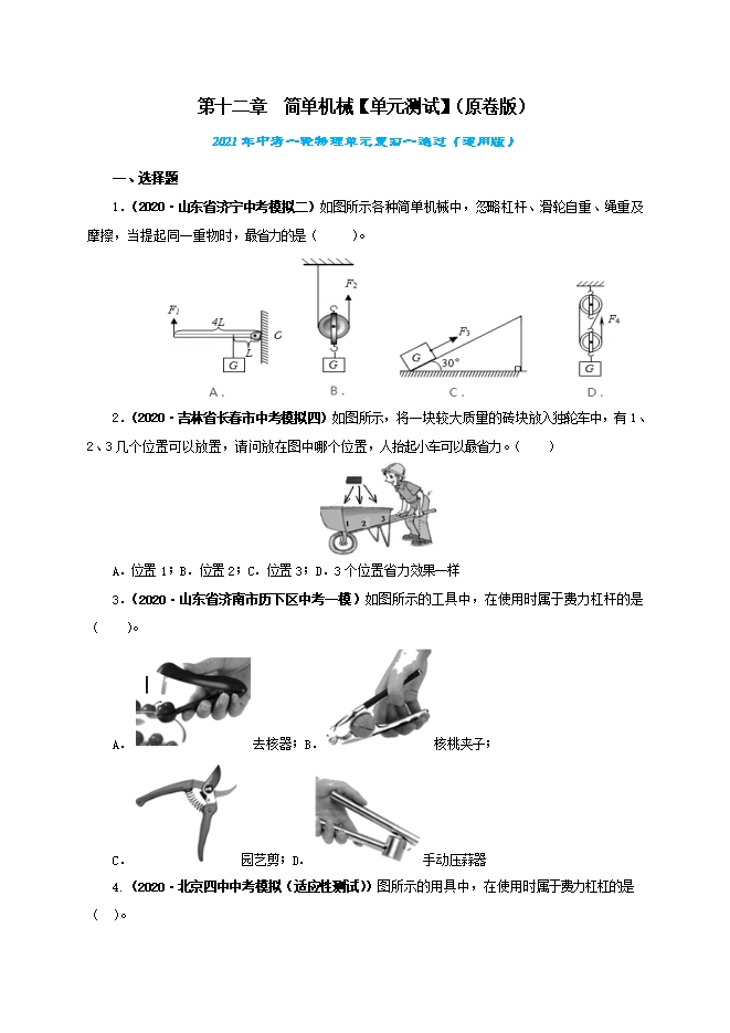 第十二章 简单机械--2021年中考物理第一轮单元复习一遍过(综合备课+真题训练+单元测试)
