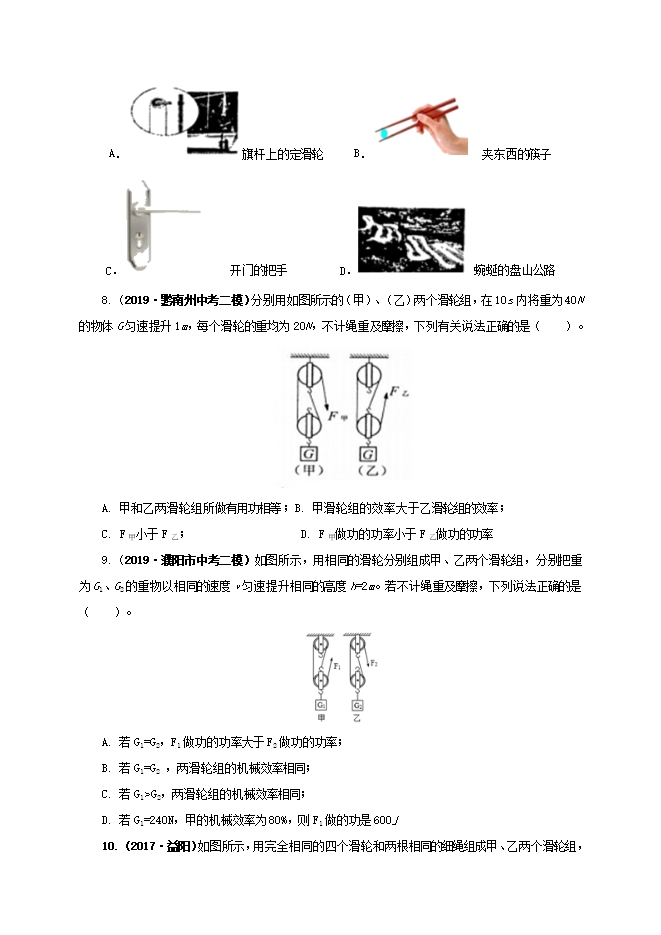 【内容简介】1.了解:杠杆的基本概念;滑轮的概念;斜面的简单应用与计算。2.会:画杠杆示意图;分析杠杆类型;进行滑轮组的常规计算。3.理解:杠杆平衡条件;定滑轮和动滑轮的特点;滑轮组的利用。4.掌握:杠杆平衡条件实验探究;有用功、总功和机械效率的计算。5.认识:生活中常用杠杆。 ★知识点一:杠杆1.杠杆:在力的作用下能绕着 转动的硬棒,这根硬棒就叫 。(1)“硬棒”泛指有一定长度的,在外力作用下 的物体。(2)杠杆可以是直的,也可以是任何形状的。2.杠杆的七要素:(1)支点:杠杆绕着转动的固定点,用字母“O”表示。它可能在棒的某一端,也可能在棒的中间,在杠杆转动时,支点是相对 ;(2)动力:使杠杆 的力叫动力,用“F1”表示;(3)阻力: 杠杆转动的力叫阻力,用“F2”表示;(4)动力作用点:动力在杠杆上的 ;(5)阻力作用点:阻力在杠杆上的 ;(6)动力臂:从支点到动力作用线的 ,用“ ”表示;(7)阻力臂:从支点到阻力作用线的 ,用“ ”表示。注意:无论动力还是阻力,都是作用在杠杆上的力,但这两个力的作用效果正好相反。一般情况下,把人施加给杠杆的力或使杠杆按照人的意愿转动的力叫做 ,而把阻碍杠杆按照需要方向转动的力叫 。力臂是点到线的距离,而不是支点到力的 的距离。力的作用线通过支点的,其力臂为 ,对杠杆的转动不起作用。3.杠杆示意图的画法:(1)根据题意先确定支点O;(2)确定动力和阻力并用虚线将其作用线延长;(3)从支点向力的作用线画垂线,并用l1和l2分别表示动力臂和阻力臂;第一步:先确定支点,即杠杆绕着某点转动,用字母“O”表示。第二步:确定动力和阻力。人的愿望是将石头翘起,则人应向下用力,画出此力即为动力用“F1”表示。这个力F1作用效果是使杠杆逆时针转动。而阻力的作用效果恰好与动力作用效果相反,在阻力的作用下杠杆应朝着顺时针方向转动,则阻力是石头施加给杠杆的,方向向下,用“F2”表示如图乙所示。第三步:画出动力臂和阻力臂,将力的作用线正向或反向延长,由支点向力的作用线作垂线,并标明相应的“l1”“l2”, “l1”“l2”分别表示动力臂和阻力臂,如图丙所示。 甲乙丙4.杠杆的平衡条件(1)杠杆的平衡:当杠杆在动力和阻力的作用下 时,我们就说杠杆平衡了。(2)杠杆的平衡条件实验 图(4)图(5)1)首先调节杠杆两端的螺母,使杠杆在水平位置平衡。如图(5)所示,当杠杆在水平位置平衡时,这样就可以由杠杆上的刻度直接读出力臂实物大小了,而图(4)杠杆在倾斜位置平衡,读力臂的数值就没有图(5)方便。由此,只有杠杆在水平位置平衡时,我们才能够直接从杠杆上读出动力臂和阻力臂的大小,因此本实验要求杠杆在水平位置平衡。2)在实验过程中绝不能再调节螺母。因为实验过程中再调节平衡螺母,就会破坏原有的平衡。(3)杠杆的平衡条件: ×动力臂=阻力× ,或F1l1=F2l2。5.杠杆的应用(1)省力杠杆:动力臂l1 阻力臂l2,则平衡时F1 F2,这种杠杆使用时可省力(即用较小的动力就可以克服较大的阻力),但却费了距离(即动力作用点移动的距离大于阻力作用点移动的距离,并且比不使用杠杆,力直接作用在物体上移动的距离大)。(2)费力杠杆:动力臂l1 阻力臂l2,则平衡时F1 F2,这种杠杆叫做费力杠杆。使用费力杠杆时虽然费了力(动力大于阻力),但却省距离(可使动力作用点比阻力作用点少移动距离)。(3)等臂杠杆:动力臂l1=阻力臂l2,则平衡时F1=F2,这种杠杆叫做等臂杠杆。使用这种杠杆既不省力,也不费力,即不省距离也不费距离。既省力又省距离的杠杆时不存在的。★知识点二:滑轮1.滑轮定义:周边有槽,中心有一转动的轮子叫 。因为滑轮可以连续旋转,因此可看作是能够连续旋转的杠杆,仍可以用杠杆的平衡条件来分析。根据使用情况不同,滑轮可分为定滑轮和动滑轮。2.定滑轮(1)定义:工作时,中间的轴 的滑轮叫定滑轮。(2)实质:是个等臂杠杆。轴心O点固定不动为支点,其动力臂和阻力臂都等于圆的半径r,根据杠杆的平衡条件可知,因为重物匀速上升时不省力。(3)特点: ,但可改变力的 。所谓“改变力的方向”是指我们施加某一方向的力能得到一个与该力方向不同的力。(4)动力移动的距离与重物移动的距离相等。对于定滑轮来说,无论朝哪个方向用力,定滑轮都是一个等臂杠杆,所用拉力都等于物体的重力G。(不计绳重和摩擦)
