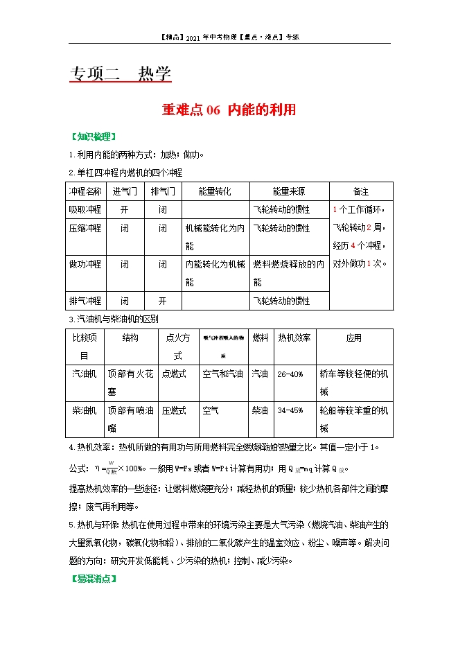 【精品】2021年中考物理【重点·难点】专练:06 内能的利用(解析版和原卷版)