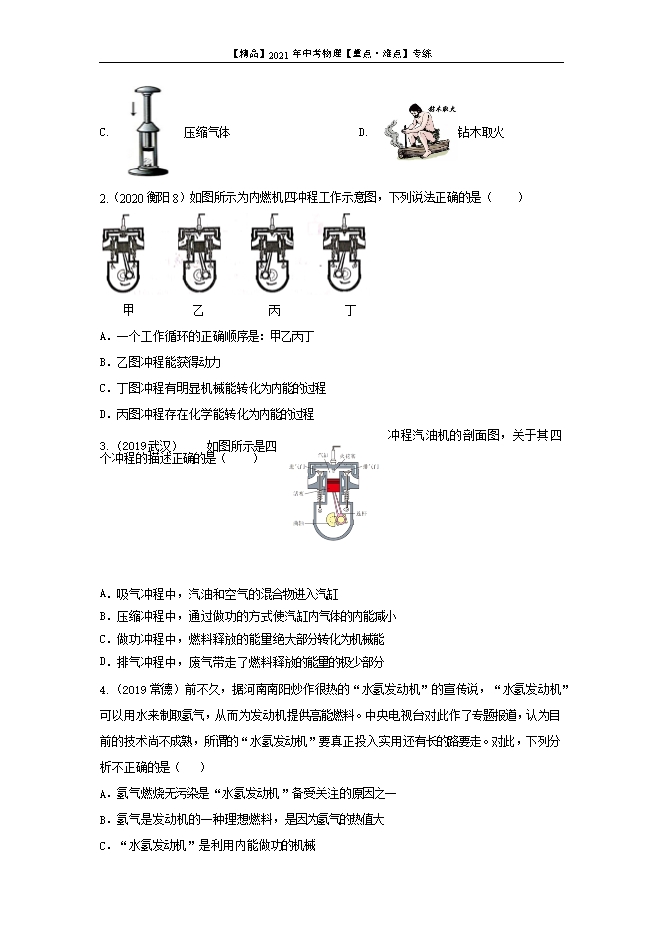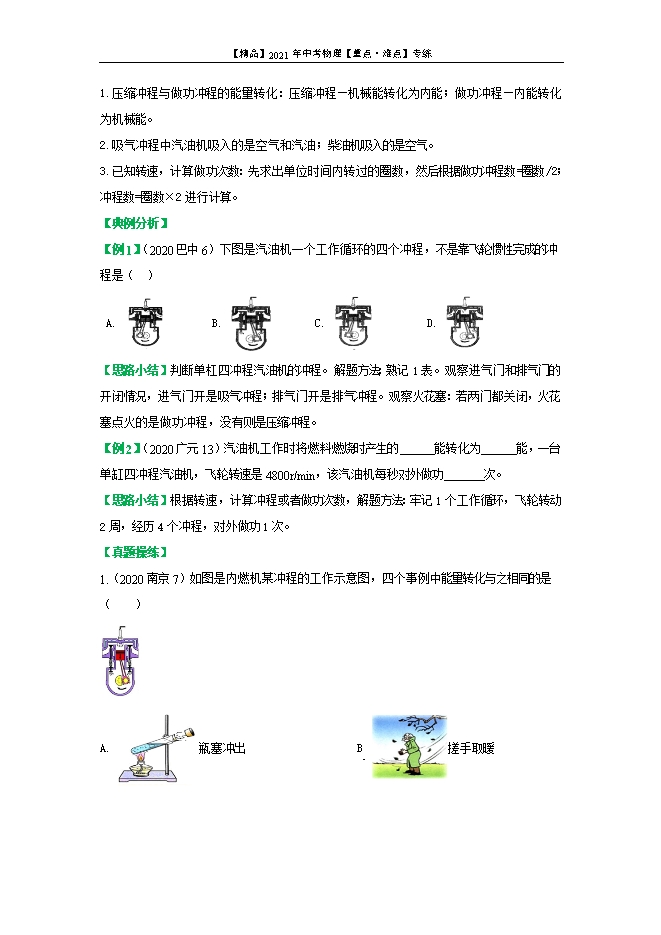 【内容简介】1.利用内能的两种方式:加热;做功。2.单杠四冲程内燃机的四个冲程冲程名称进气门排气门能量转化能量来源备注吸取冲程开闭飞轮转动的惯性1个工作循环,飞轮转动2周,经历4个冲程,对外做功1次。压缩冲程闭闭机械能转化为内能飞轮转动的惯性做功冲程闭闭内能转化为机械能燃料燃烧释放的内能排气冲程闭开飞轮转动的惯性3.汽油机与柴油机的区别比较项目结构点火方式吸气冲程吸入的物质燃料热机效率应用汽油机顶部有火花塞点燃式空气和汽油汽油26-40%轿车等较轻便的机械柴油机顶部有喷油嘴压燃式空气柴油34-45%轮船等较笨重的机械4.热机效率:热机所做的有用功与所用燃料完全燃烧释放的热量之比。其值一定小于1。公式:η= ×100%。一般用W=Fs或者W=Pt计算有用功;用Q放=mq计算Q放。提高热机效率的一些途径:让燃料燃烧更充分;减轻热机的质量;较少热机各部件之间的摩擦;废气再利用等。5.热机与环保:热机在使用过程中带来的环境污染主要是大气污染(燃烧汽油、柴油产生的大量氮氧化物,碳氧化物和铅)、排放的二氧化碳产生的温室效应、粉尘、噪声等。解决问题的方向:研究开发低能耗、少污染的热机;控制、减少污染。【易混淆点】1.压缩冲程与做功冲程的能量转化:压缩冲程—机械能转化为内能;做功冲程—内能转化为机械能。2.吸气冲程中汽油机吸入的是空气和汽油;柴油机吸入的是空气。3.已知转速,计算做功次数:先求出单位时间内转过的圈数,然后根据做功冲程数=圈数/2;冲程数=圈数×2进行计算。【典例分析】【例1】(2020巴中6)下图是汽油机一个工作循环的四个冲程,不是靠飞轮惯性完成的冲程是( )A. B. C. D. 【答案】B【分析】在汽油机的四个冲程中只有做功冲程对外做功,其它三个冲程都是靠飞轮的惯性完成的。A.图中排气门打开,活塞向上运动,气缸容积减小,排气冲程,A错。B.图中两气门都关闭,活塞向下运行,火花塞点火,气缸容积增大,做功冲程,B正确。C.图中两气门都关闭,活塞向上运行,气缸容积减小,压缩冲程,C错。D.图中进气门打开,活塞向下运行,气缸容积增大,吸气冲程,D错。选B。【思路小结】判断单杠四冲程汽油机的冲程。解题方法:熟记1表。观察进气门和排气门的开闭情况,进气门开是吸气冲程;排气门开是排气冲程。观察火花塞:若两门都关闭,火花塞点火的是做功冲程,没有则是压缩冲程。【例2】(2020广元13)汽油机工作时将燃料燃烧时产生的 能转化为 能,一台单缸四冲程汽油机,飞轮转速是4800r/min,该汽油机每秒对外做功 次。【答案】内 机械 40【分析】汽油机工作时将燃料燃烧时产生的内能转化为机械能。由题意可知:单缸四冲程汽油机的飞轮转速是4800r/min,即80r/s,完成160个冲程,4个冲程对外做功一次,所以对外做功40次。【思路小结】根据转速,计算冲程或者做功次数,解题方法:牢记1个工作循环,飞轮转动2周,经历4个冲程,对外做功1次。【真题操练】1.(2020南京7)如图是内燃机某冲程的工作示意图,四个事例中能量转化与之相同的是( ) A. 瓶塞冲出 B 搓手取暖C. 压缩气体 D. 钻木取火【答案】A【解析】根据图示可知:两个气门都关闭,活塞向下运动,因此该冲程为做功冲程,将内能转化为机械能。A.试管内气体对瓶塞做功,气体的内能转化为瓶塞的机械能,A正确。B.搓手取暖,克服摩擦力做功,把机械能转化为内能,内能增加,B错。C.外界对筒内空气做功,空气的内能增大、温度升高,达到了棉花的着火点,棉花就会燃烧,此过程中机械能转化为内能,C错。D.钻木取火过程中,克服摩擦力做功,机械能转化为内能,内能增加,D错。选A。
