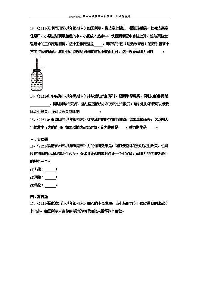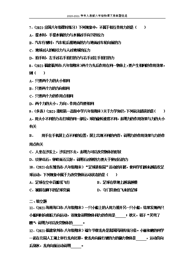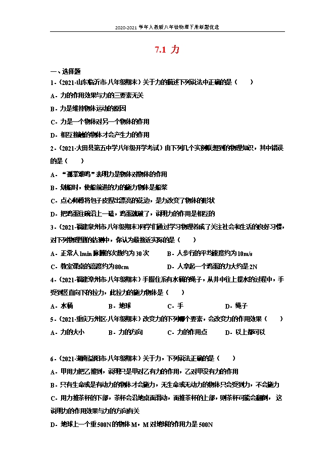 【内容简介】一、选择题1.(2021•山东临沂市•八年级期末)关于力的描述下列说法中正确的是( )A.力的作用效果与力的三要素无关B.力是维持物体运动的原因C.力是一个物体对另一个物体的作用D.相互接触的物体才会产生力的作用2.(2021•大田县第五中学八年级开学考试)由下列几个实例联想到的物理知识,其中错误的是( )A.“孤掌难鸣”表明力是物体对物体的作用B.划船时,使船前进的力的施力物体是船桨C.点心师傅将包子皮捏出漂亮的花边,是力改变了物体的形状D.把鸡蛋往碗沿上一磕,鸡蛋就破了,说明力的作用是相互的3.(2021•福建泉州市•八年级期末)同学们通过学习物理养成了关注社会和生活的良好习惯,对下列物理量的估测中,你认为最接近实际的是( )A.正常人lmin脉膊的次数约为30次B.人步行的平均速度约为10m/sC.教室课桌的高度约为80cmD.人拿起一个鸡蛋的力大约是2N4.(2021•福建漳州市•八年级期末)手握住系有水桶的绳子,从井中往上提水的过程中,手受到竖直向下的拉力,此拉力的施力物体是( )A.水桶B.地球C.手D.绳子5.(2021•重庆万州区•八年级期末)改变力的下列哪个要素,会改变力的作用效果( )A.力的大小B.力的方向C.力的作用点D.以上都可以6.(2021•湖南益阳市•八年级期末)关于力,下列说法正确的是( )A.甲用力把乙推到,说明只是甲对乙有力的作用,乙对甲没有力的作用B.只有生命或是有动力的物体才会施力,无生命或无动力的物体只会受到力,不会施力C.用力推茶杯的下部,茶杯会沿地桌面滑动,而推茶杯的上部,则茶杯可能会翻倒, 这说明力的作用效果与力的方向有关D.地球上一个重500N的物体M,M对地球的作用力是500N7.(2021•全国八年级课时练习)下列现象中,不属于相互作用力的是( )A.提水时,手提水桶的力与水桶对手向下的拉力B.汽车行驶时,汽车轮后推地面的力与地面对车轮向前的力C.地球对人的吸引力与人对地球的压力D.拍手时,左手对右手拍打的力与右手对左手拍打的力8.(2021•福建福州市•八年级期末)两个力先后作用在同一物体上,要产生相同的作用效果,则( )A.只要两个力的大小相同B.只要两个力的方向相同C.只要两个力的作用点相同D.两个力的大小、方向、作用点均要相同9.(多选)(2021•淮阳第一高级中学八年级期末)关于力学知识,下列说法错误的是( )A.用大小不同的力击打球的同一部位,球的旋转速度不同,表明力的作用效果与力的大小有关B. 用手在手机屏上点不同的位置,屏上出现不同的内容,说明力的作用效果与力的作用点有关C.人坐在沙发上,沙发凹下去,表明力可以改变物体的形状D.以卵击石,卵碎而石完好,说明石对卵的力要大于卵对石的力10.(2021•山东潍坊市•八年级期末)“足球进校园”活动的开展,使同学们越来越喜欢足球运动,下列现象中属于力改变物体运动状态的是( )A.足球在空中沿弧线飞行B.足球在草地上越滚越慢C.被踩在脚下的足球变扁D.守门员抱住飞来的足球