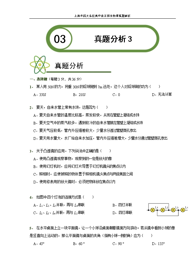【内容简介】一、选择题(每题3分,共36分)1. 某人用50N的力,将重30N的铅球抛到7m远处,这个人对铅球做的功为( )A.350JB.210JC.0D.无法计算【答案】D【解析】人推铅球,对铅球施加了力,并且铅球在该力的方向上移动了距离,根据功的公式由W=Fs可知,功等于力和物体在力的方向上通过的距离的乘积,在推铅球的过程中,知道用力的大小,但不知道在力的方向上移动距离的大小,所以无法计算功的大小。故选D. 2. 夏天,自来水管上常有水珠,这是因为( )A.夏天自来水管的温度比较高,蒸发较快,从而在管壁上凝结成水珠B.夏天空气中的蒸汽较多,遇到较冷的自来水管就在管壁上凝结成水珠C.夏天气压较低,管内外压强差较大,少量水分透过管壁微孔渗出D.夏天用水量大,水厂给自来水加压,管内外压强差增大,少量水分通过管壁微孔渗出【答案】B【解析】物质由气态变为液态的过程称为液化使气体液化的方法有两种:①增大压强使气体液化;②降低温度使气体液化;我们常见的是降低温度时气体液化的现象夏天,自来水管中的水温比外界空气温度要低得多,导致管壁比周围的空气温度低,空气中的水蒸气遇到比它温度低的水管外壁会放热液化成小水滴,就是我们看到的自来水管外壁“出汗”现象。故选B. 3. 关于凸透镜的应用,下列说法中正确的是( )A.使用凸透镜观察事物,观察到的一定是放大的像B.使用幻灯机时,应将幻灯片导置于幻灯机镜头的焦点以内C.照相时,应使被照的物体置于照相机镜头焦点与两倍焦距之间D.使用修表用的放大镜时,必须把物体放在焦点以内【答案】D【解析】A. 使用凸透镜观察物体,观察到的可能是放大的像,也可能是缩小的像,故A错误;B. 使用幻灯机时,2f>u>f,成倒立、放大的实像,因此,幻灯片一定倒插在幻灯机镜头的一倍焦距与二倍焦距之间,故B错误;C. 照像时,应使被照的物体置于照相机镜头的2倍焦距之外,能成倒立、缩小的实像,故C错误;D. 修理手表时用的放大镜,必须把手表放在1倍焦距之内,此时成正立、放大的虚像,故D正确。故选D. 4. 如图中四个灯泡的连接方式是( )A.L1、L2、L3并联,再与L4串联B.四灯并联C.L2、L3、L4并联,再与L1串联D.四灯串联【答案】A【解析】 由电路图知,图中四个灯泡中,灯L1,L2,L3先并联,然后再与L4串联,等效电路图如图所示;故选A。5. 在水平桌面上立一块平面镜,让一个小球沿桌面朝着镜面方向滚动。若从镜中看到小球的像是竖直向上运动的,那么平面镜与桌面的夹角(指有小球一侧的角)应为( )A.45°B.60 °C.90 °D.135°【答案】A【解析】根据题意,小球沿桌面水平方向运动,镜中小球的像竖直向下运动,由平面镜成像的特点,像与物连线与镜面垂直,像与物相对于平面镜对称,所以平面镜与桌面的夹角为45°。故A符合题意为答案。选项B,C,D不符合题意。