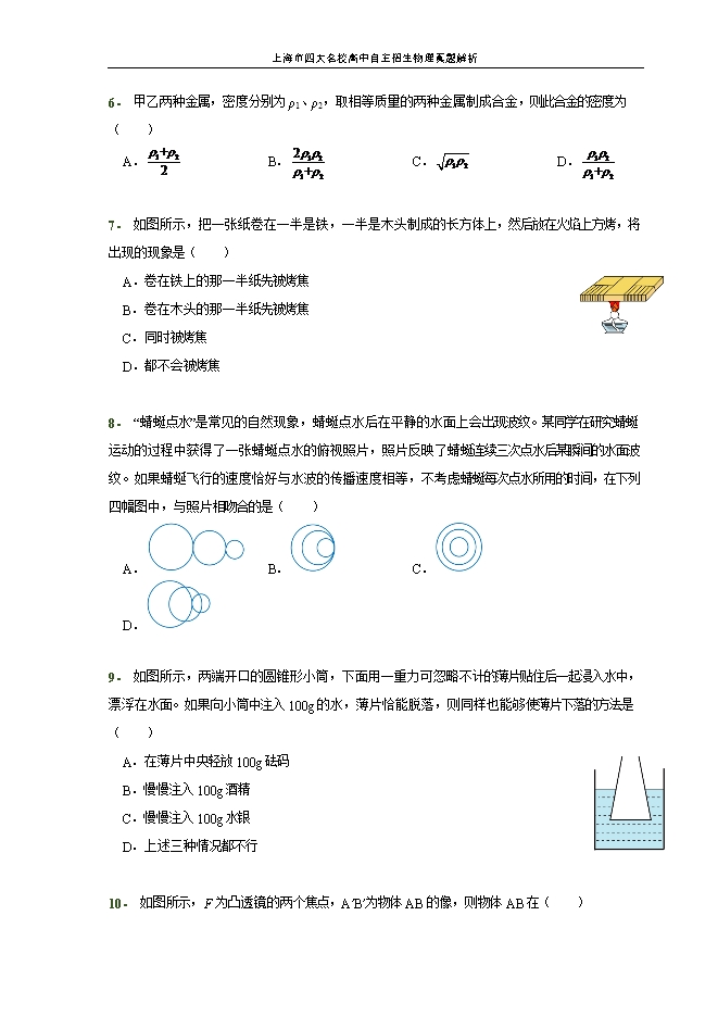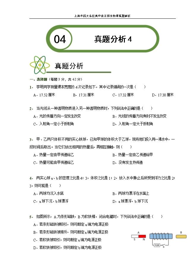 【内容简介】一、选择题(每题3分,共42分)李明同学测量课本宽度的4次记录如下,其中记录错误的一次是( )A.17.52厘米B.17.31厘米C.17.32厘米D.17.30厘米【答案】A【解析】B. C. D选项所给的数据相差很小,在误差允许的范围内。但A选项所给的数据与后三项相比相差太大,在1mm(1个最小刻度)以上,显然A是错误的。当光线从一种透明物质进入另一种透明物质时,下列说法中正确的是( )A.光的传播方向一定发生改变B.光线的传播方向有时不发生改变C.入射角一定小于折射角D.入射角一定大于折射角【答案】B【解析】当入射光线与两种物质的界面垂直时,其传播方向不发生改变。当入射光线与两种物质的界面不垂直时,其传播方向将发生改变。所以光线从一种透明物质进入另一种透明物质时,其传播方向不一定变。 故A错误,B正确。当光线从光密介质(如水)斜射进入光疏介质(如空气)时,入射角小于折射角;当光线从光疏介质斜射进入光密介质时,入射角大于折射角;故CD错误甲、乙两只体积不同的实心铁球,已知甲球的体积大于乙球,现将他们投入同一沸水中,一段时间后取出。当它们放出相同的热量后,再相互接触,则( )A.热量一定由甲传递给乙B.热量一定由乙传递给甲C.热量可能由甲传递给乙D.没有发生热传递【答案】A【解析】两个都是铁球,所以比热容c相同;又因为放出的热量Q放相同,已知甲球的体积大于乙球,故质量关系为m甲>m乙,所以根据∆t=Q_放/cm可知,甲降低的温度小于乙降低的温度,即甲的末温高。所以热量将从甲传到乙。故选A. 两实心球a、b的密度之比是4:3,体积之比是1:2,放入水中静止后所受到浮力之比是2:3,则可能是( )A.两球均沉入水底B.两球均漂浮在水面上C.a球下沉、b球漂浮D.a球漂浮,b球下沉【答案】B【解析】A选项,如果两球均沉入水底,则他们排开水的体积之比为1:2,此时受到浮力之比为1:2,故A错误;B选项,球a,b的质量之比为 ,如果两球均漂浮在水面上,则他们所受浮力等于重力,因此浮力之比为2:3,故B正确;C,D选项,若a,b球有一个漂浮,则其受到的浮力小于重力,因此浮力之比不再是2:3故C,D错误。如图所示,A为条形磁铁,B为软铁棒,闭合电键时,下列说法中正确的是( )A.若条形磁铁被吸引,则可断定a端为电源正极B.若条形磁铁被排斥,则可断定a端为电源正极C.若软铁被吸引,则可断定a端为电源正极D.若软铁被吸引,则可断定b端为电源正极【答案】B【解析】A,若条形磁铁被吸引,利用磁极间的作用规律可以确定螺线管的左端为S极,右端为N极;再结合线圈绕向,利用安培定则可以确定螺线管中的电流方向是从螺线管的右端流入,左端流出,所以电源的右端即b端为正极。故A错误。若条形磁体被排斥,利用磁极间的作用规律可以确定螺线管的左端为N极,右端为S极;再结合线圈绕向,利用安培定则可以确定螺线管中的电流方向是从螺线管的左端流入,右端流出,所以电源的左端即a端为正极。故B正确。无论电源的左端是正极还是电源的右端为正极,只要开关闭合后,螺线管中就有电流通过,电磁铁就有磁性,电磁铁就会吸引软铁。因此根据软铁被吸引不能确定电源的正负极。故C,D错误。