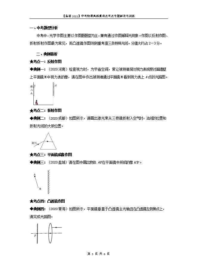 【内容简介】光学作图是学习光学的重要组成部分,也是各省市中考的主要的考查点之一。通过光学作图能考查学生对光学知识模块的理解和掌握情况,而且也能考查学生的画图能力、分析能力和解决实际问题的能力。考查的主要有反射作图、折射作图平面镜成像作图和透镜作图四个方面的作图。 一、光学作图要求:在光学作图中,无论是哪类作图,都要注意以下几点:1、分清实线和虚线:入射光线、反射光线及折射光线均用实线表示,虚像、法线和光的反向延长线等均用虚线表示。2、光线连续不能断开,箭头要标正确:入射光线的箭头方向都是“指向界面”,反射、折身光线的箭头方向都是“背离界面”;3、分清角的关系:不要把入(或反或折)射光线与反射面或界面的夹角视为入(或反或折)射角。4、作图一定要用尺规作图,并保留作图痕迹,作图清晰规范,不能涂改。5、法线与界面或反射面垂直,标垂直符号。二、光学作图方法:1、反射作图:方法一 根据光的反射定律作图,适用于较简单的作图:(1)过入(反)射光线和界面的交点且垂直界面作法线(用虚线表示),并标垂直符号;(2)根据反射角等于入射角,利用量角器作出反(入)射光线,并标上箭头。方法二 利用平面镜成像特点作图,适合较复杂的作图:(1)作发光点关于平而统的对称点,即像点;(2)用虚线连接像点和光线接收点(或人眼)交平面镜于一点,即为反射点;(3)用实线连接发光点与反射点,标上箭头为入射光线,用实线连接光线接收点(或人眼)与反射点,标上箭头,即为反射光线。2、折射作图:(1)确定入(折)射点:入(折)射光线与界面的交点即为入(折)射点;(2)根据法线和折射面垂直,过入(折)射点作出法线(用虚线),并标出垂直符号;(3)根据光的折射定律,画出入射光找的折射光线、或画出折射光线的入射光线(通常情况下,不管是入射角还是折射角,总是空气中的角较大)(4)对于较复杂的折射作图,由于人的眼睛总认为光是沿直线传播的,所以可以连接人眼和人眼看到的像,根据光的折射规律确定入射点,从而确定入射光线和折射光线,注意传播方向。3、平面镜成像作图:方法一 根据平面镜成特点作图——所有线均用虚线:(1)选取物体上的特殊点(物点);(2)根据平面镜成像有对称性的特点,找出特殊点关于平面镜的对称点(即像点的位置);(3)用虚线连接特殊点(物点)和对称点(像点)(4)用虚线连接对称点即为虚像。方法二 根据反射定律作图:(1)作出物点射到平面镜上的任意两条光线;(2)根据反射定律作出其反射光线;(3)将反射光线反向延长交于平面镜后的一点(镜后的反向延长线要画虚线,虚线不加箭头),该点即为物点的像点。4、透镜作图:作图主要以三条特殊光线为依据。光线特点过光心平行主光轴过焦点凸透镜 穿心不变 平行过焦 过焦平行凹透镜 穿心不变 平行过焦 过焦平行 一、中考题型分析中考中,光学作图主要以作图题题型为主,兼有通过作图解释光现象。作图以反射作图、折射折射作图最为常见,而凸透镜作图则侧重考查三条特殊光线。分值大约占2—3分。二、典例精析★考点一:反射作图◆典例一:(2020河南)检查视力时,为节省空间,常让被测者背对视力表观察对面墙壁上平面镜M中视力表的像,请在图中作出被测者通过平面镜M看到视力表上A点的光路图。
